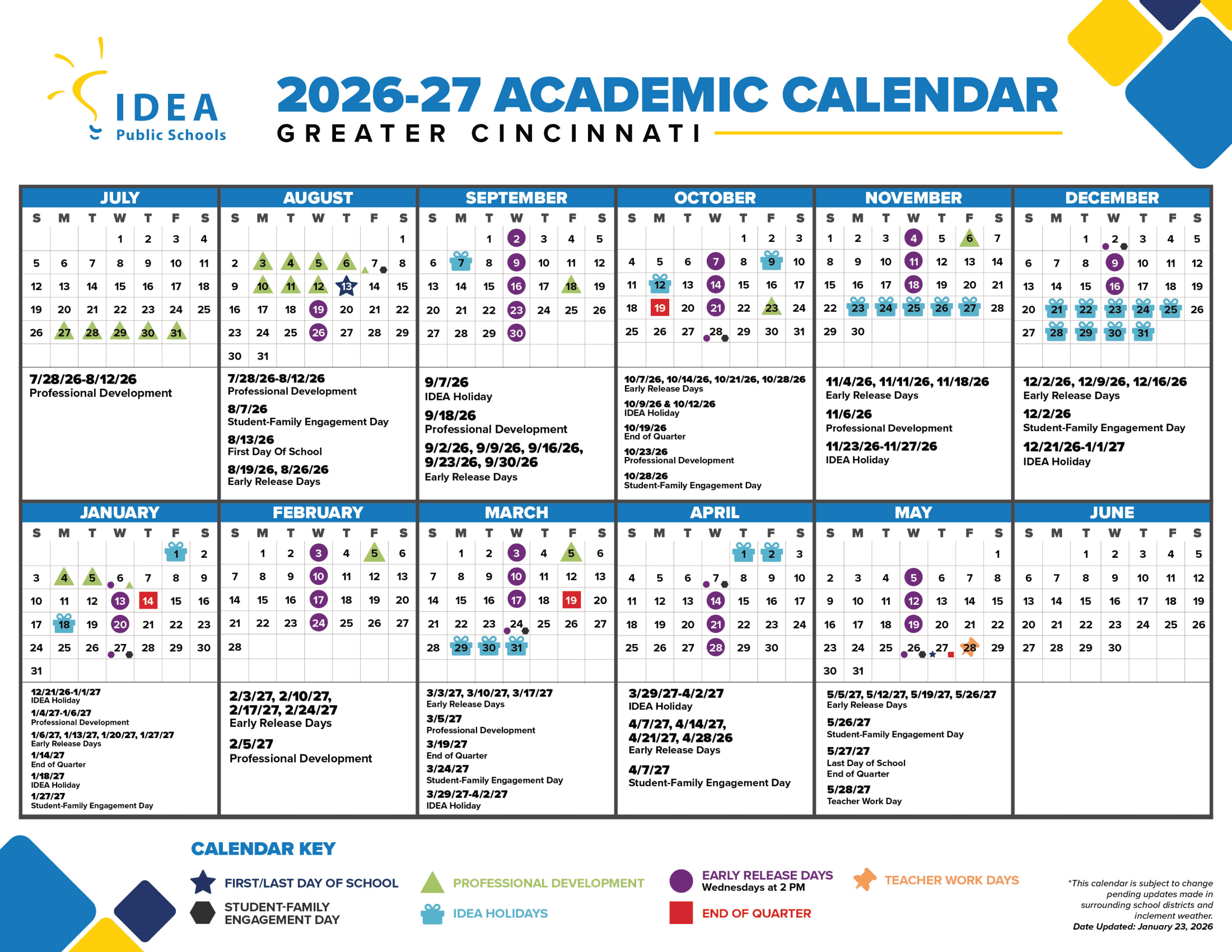 Dates are sourced from the official IDEA Public Schools Greater Cincinnati 26-27 Calendar [PDF] website. Dates may change at the discretion of the district. Always verify with the official school website for the latest updates.