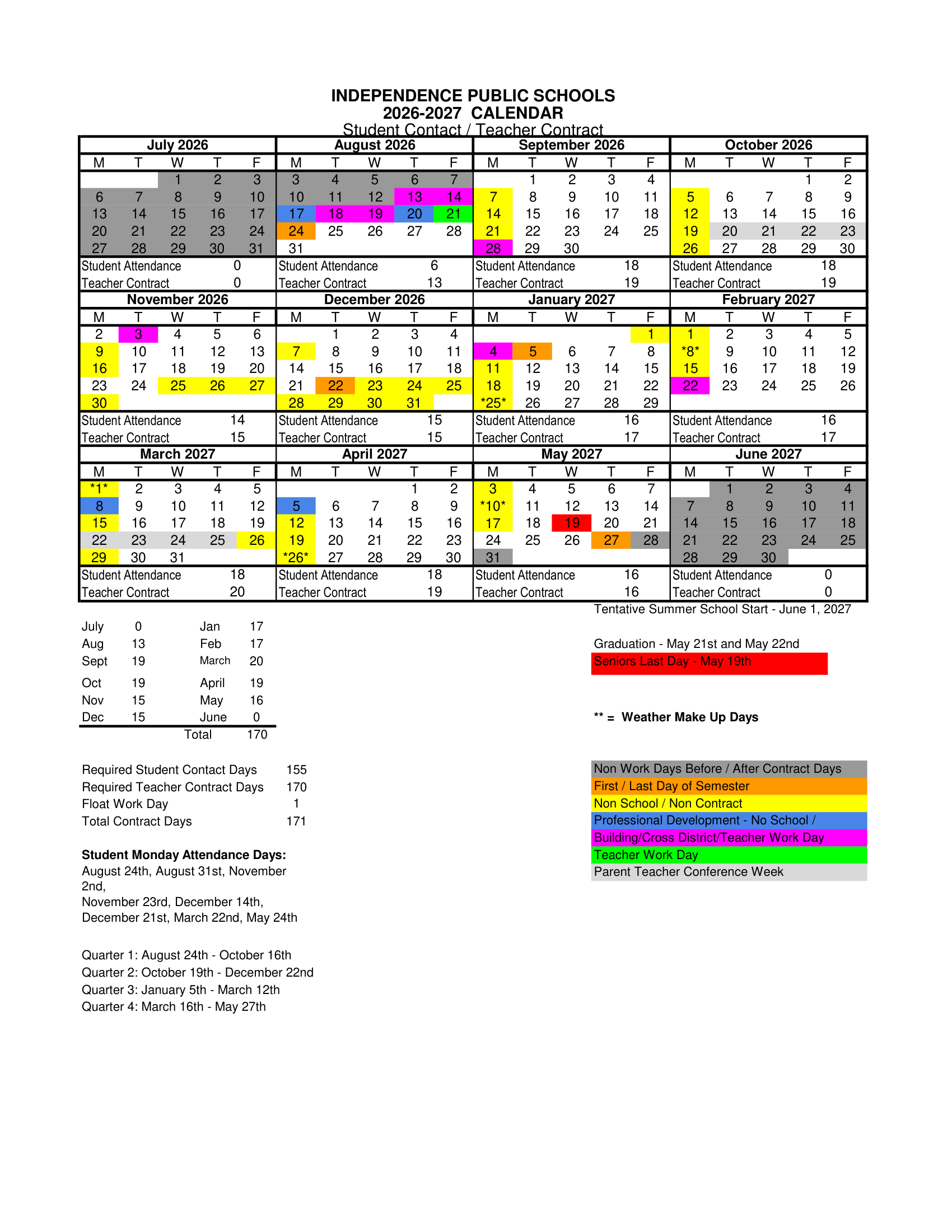 Dates are sourced from the official Independence Public Schools mo Calendar 26-27 Revised [PDF] website. Dates may change at the discretion of the district. Always verify with the official school website for the latest updates.