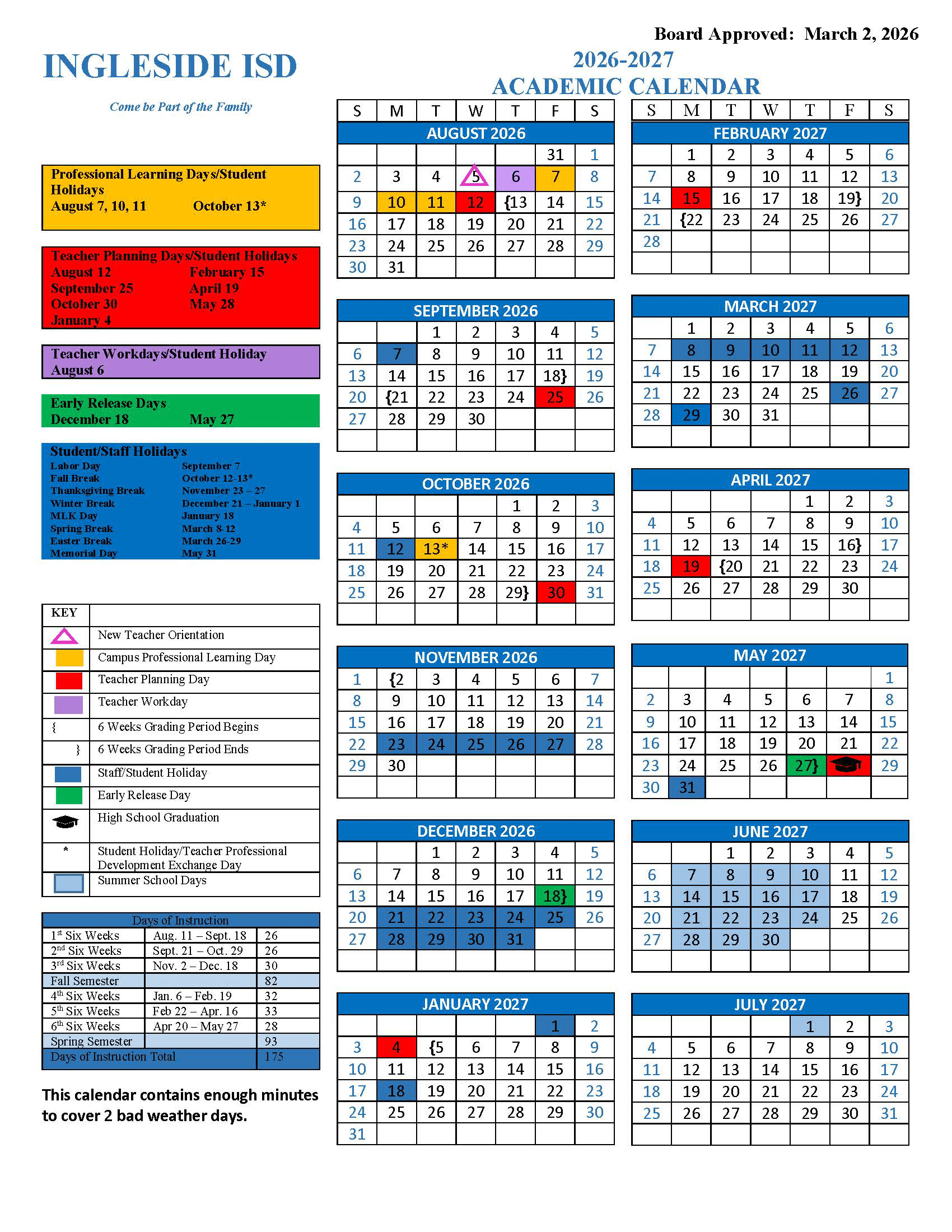 Dates are sourced from the official Ingleside ISD 26-27 Calendar Revised [PDF] website. Dates may change at the discretion of the district. Always verify with the official school website for the latest updates.