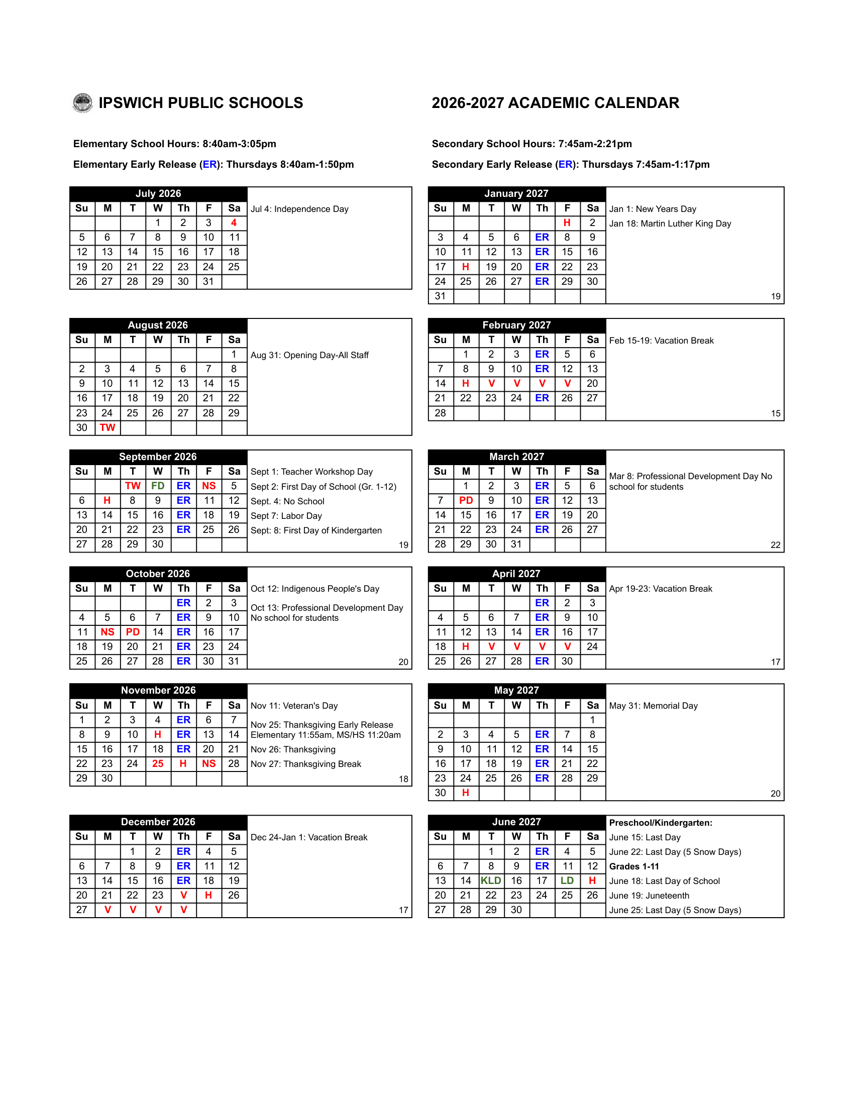 The Printable school calendar provided on this page is taken from the official Ipswich Public Schools District Calendar 26-27 Updates. Please note that all dates and events are subject to change at the discretion of the school district. For the most accurate and updated information, please refer to the official district website or contact the school helpline.