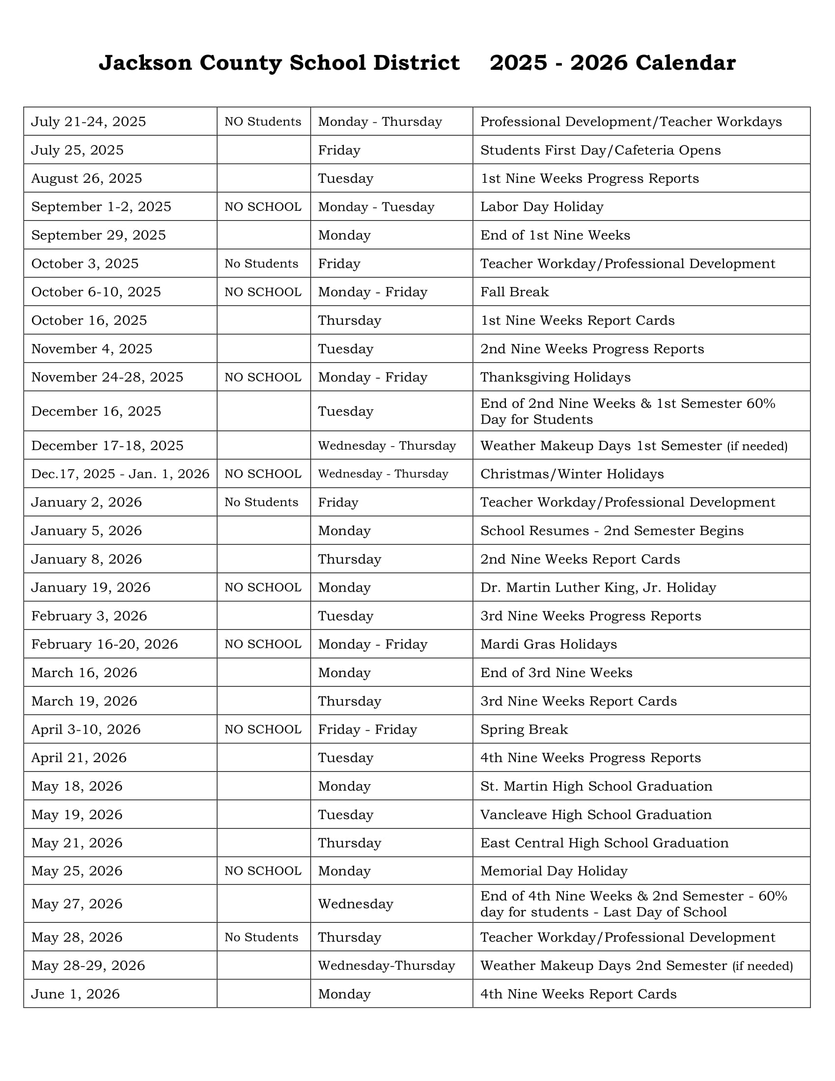 The printable school calendar provided on this page is taken from the official Jackson County School District Calendar website. Please note that all dates and events are subject to change at the discretion of the school district. For the most accurate and updated information, please refer to the official district website or contact the school helpline.