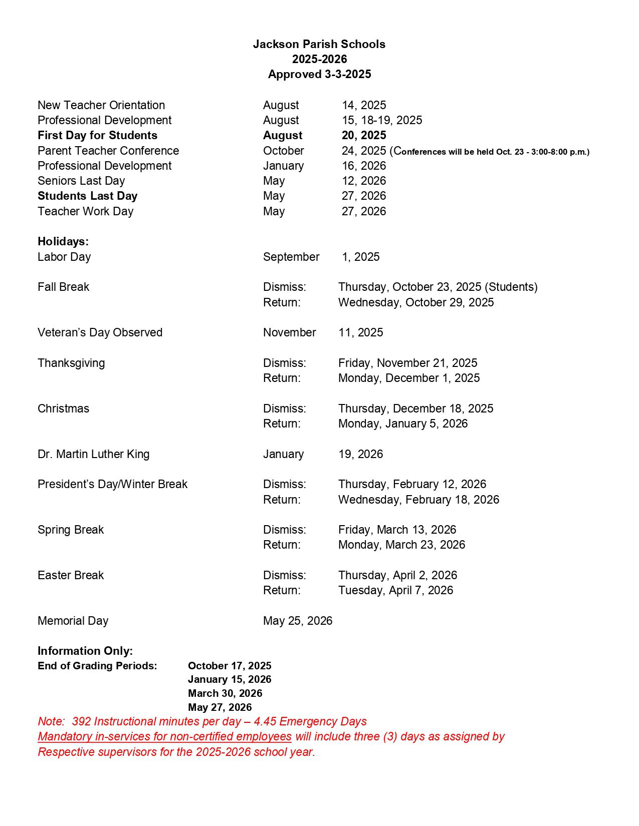 The last day of school for students in Jackson Parish Schools for the 2025-2026 school year is May 27, 2026.