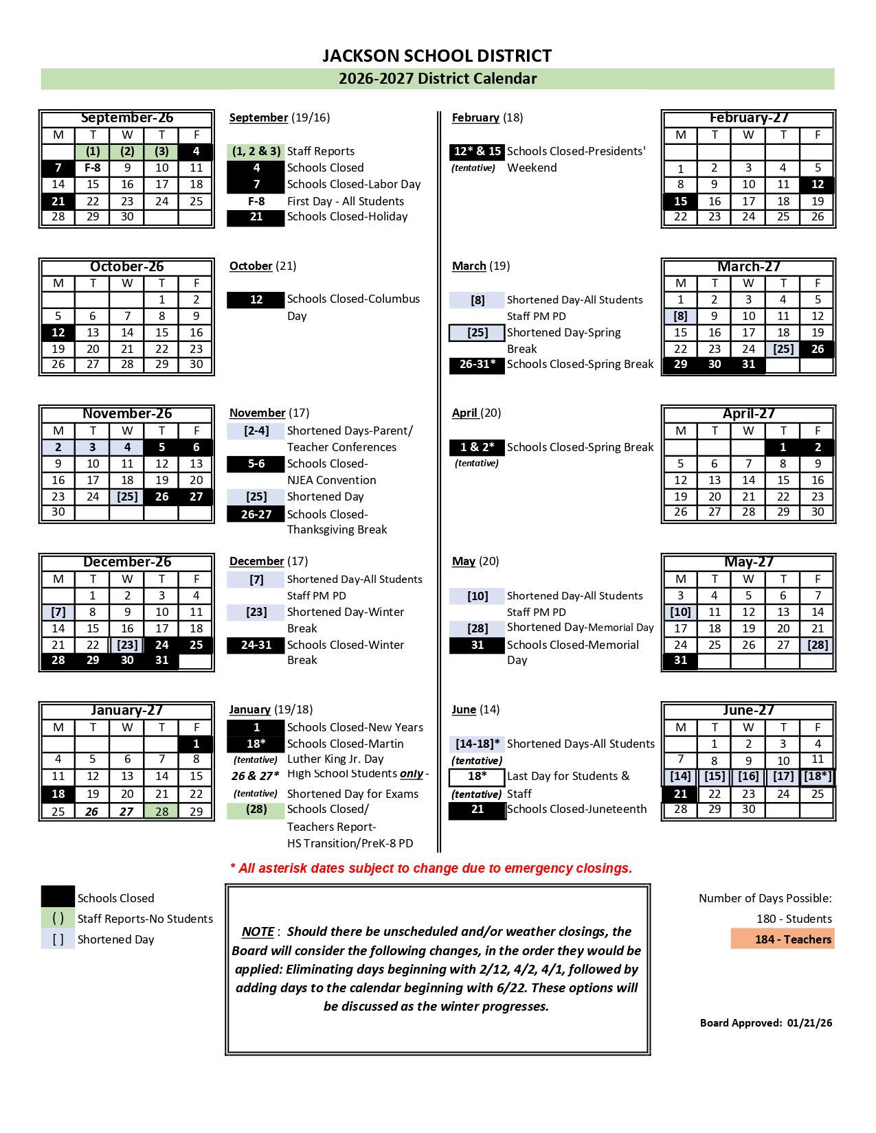 Dates are sourced from the official JACKSON SCHOOL DISTRICT 26-27 Calendar [PDF] website. Dates may change at the discretion of the district. Always verify with the official school website for the latest updates.