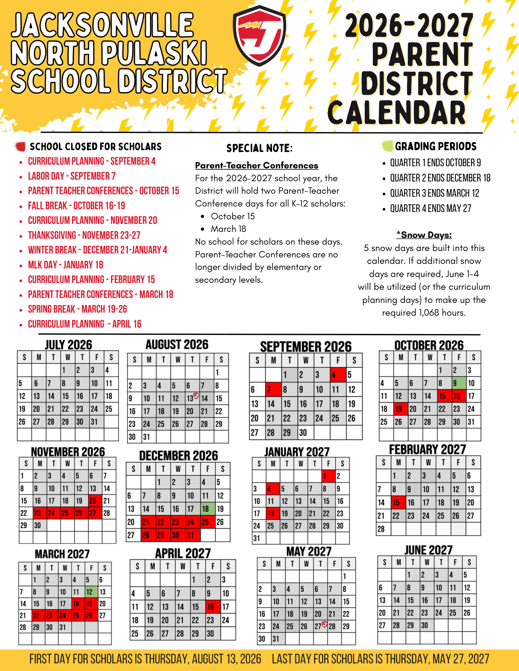 Dates are sourced from the official Jacksonville North Pulaski School District 26-27 Calendar Updates [PDF] website. Dates may change at the discretion of the district. Always verify with the official school website for the latest updates.