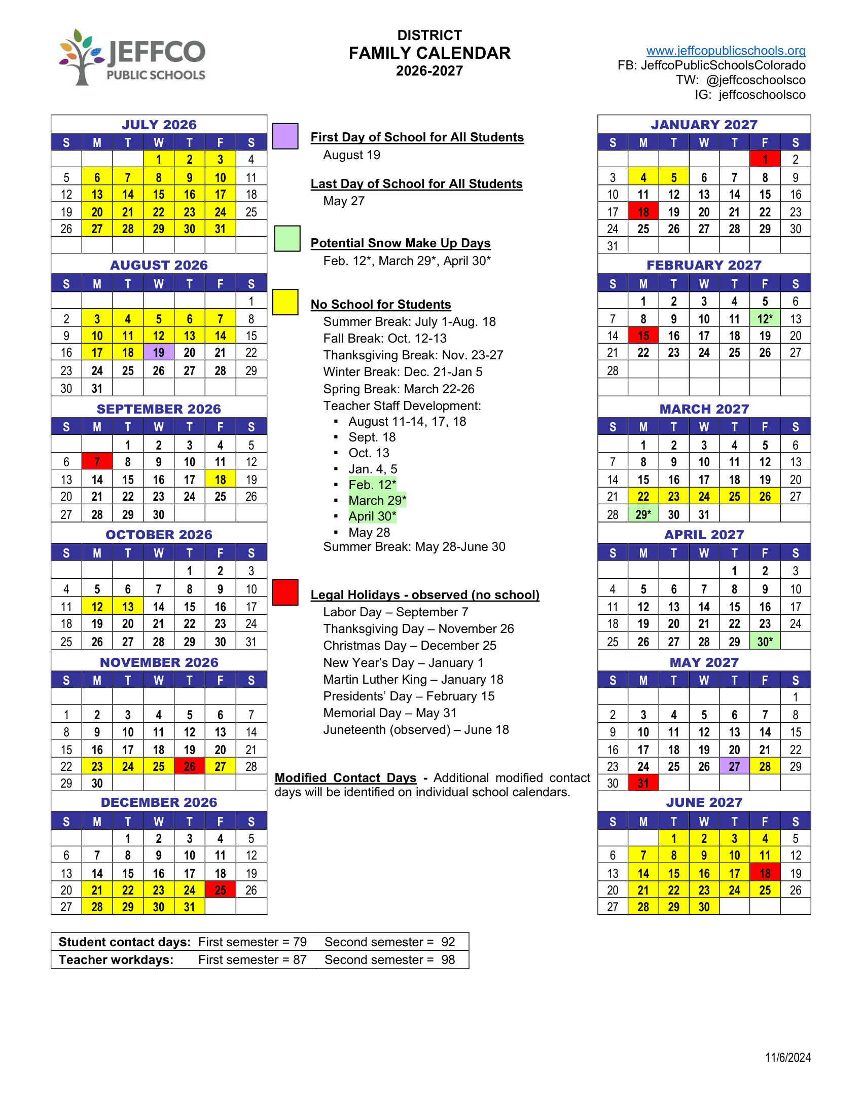 Jeffco Public Schools Calendar (2026-2027)
