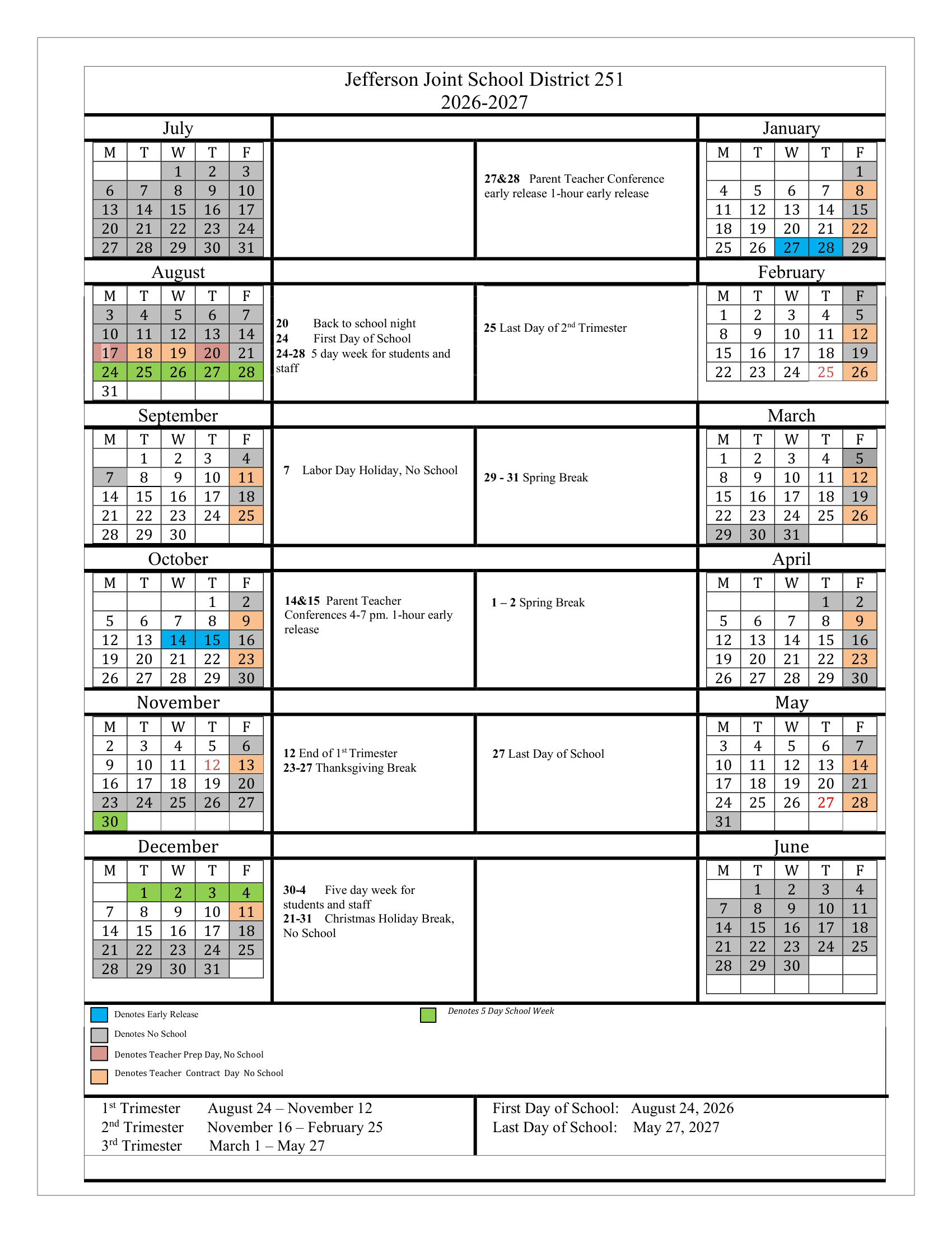 Dates are sourced from the official Jefferson Joint School District 251 26-27 Calendar [PDF] website. Dates may change at the discretion of the district. Always verify with the official school website for the latest updates.