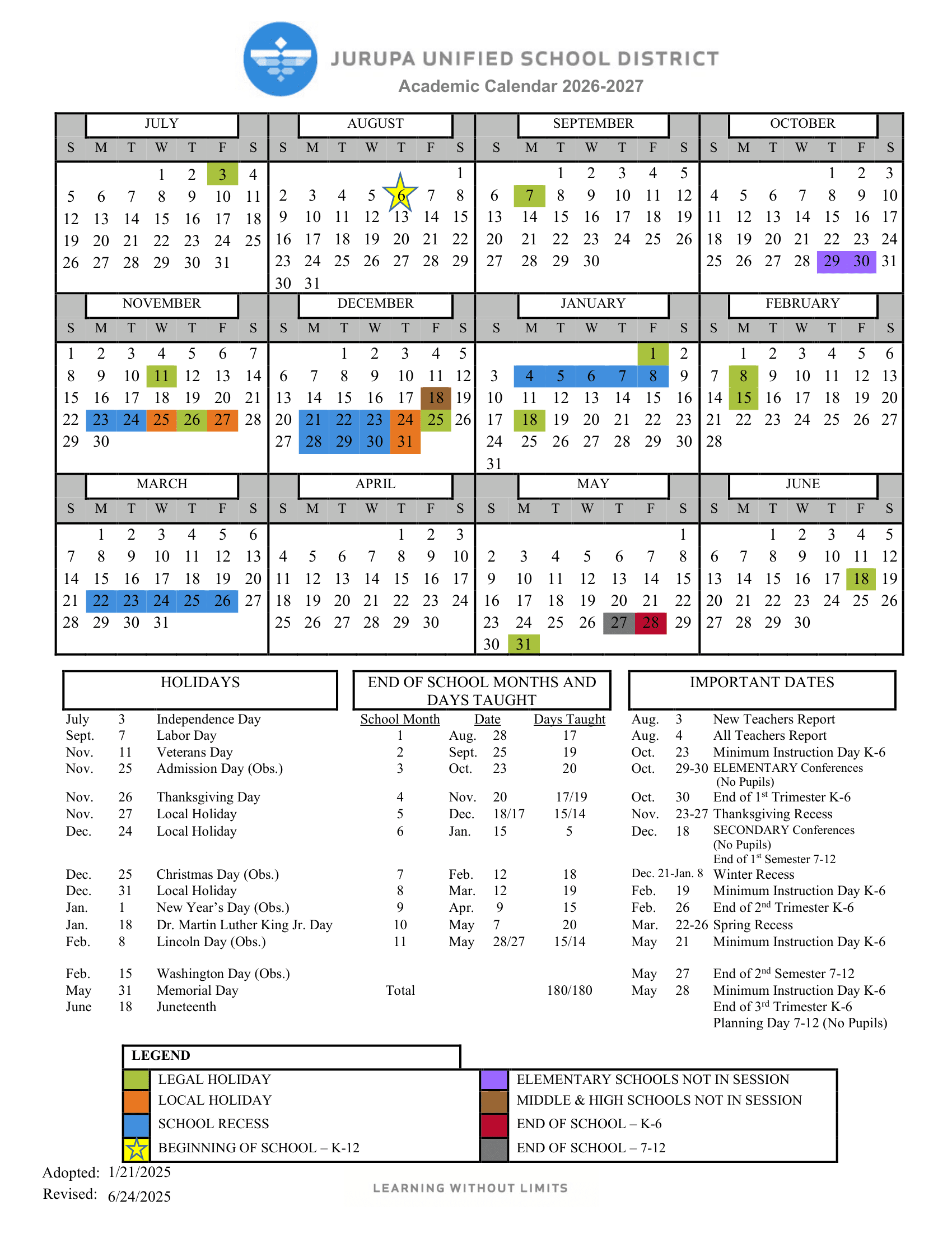 Dates are sourced from the official Jurupa Unified School District USD Calendar 26-27 Revised [PDF] website. Dates may change at the discretion of the district. Always verify with the official school website for the latest updates.