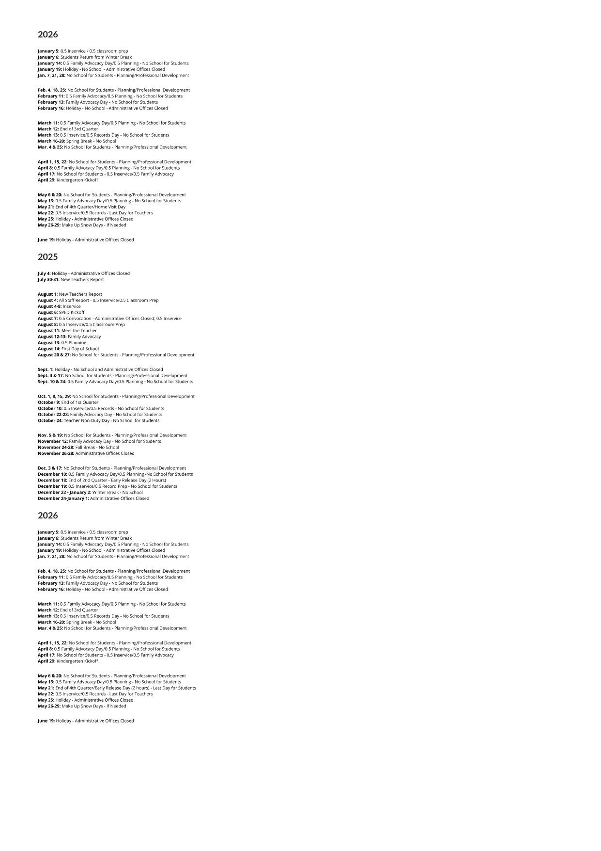 | November 24-28, 2025 | Fall Break-No School |