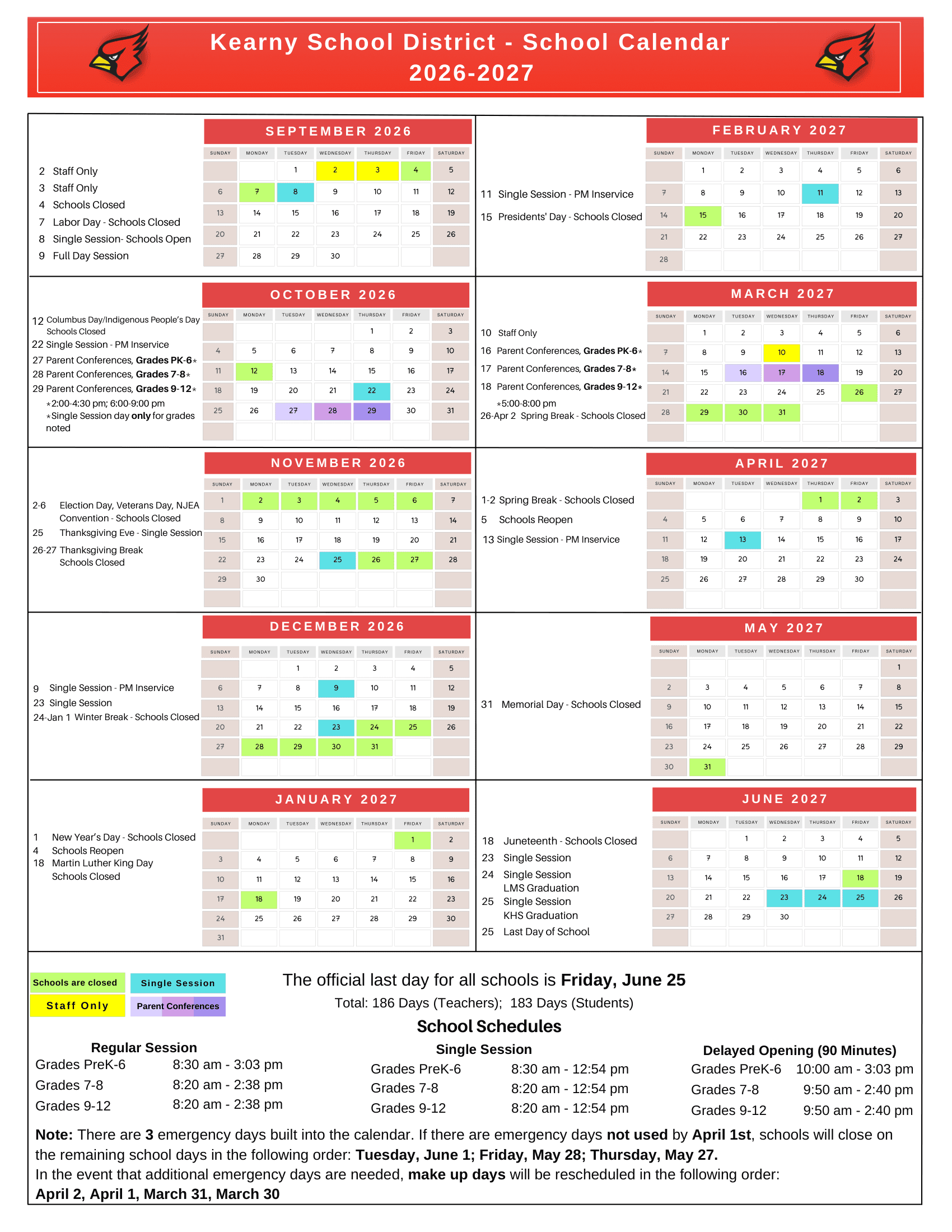 Dates are sourced from the official Kearny School District NJ Calendar 26-27 Revised [pdf] website. Dates may change at the discretion of the district. Always verify with the official school website for the latest updates.