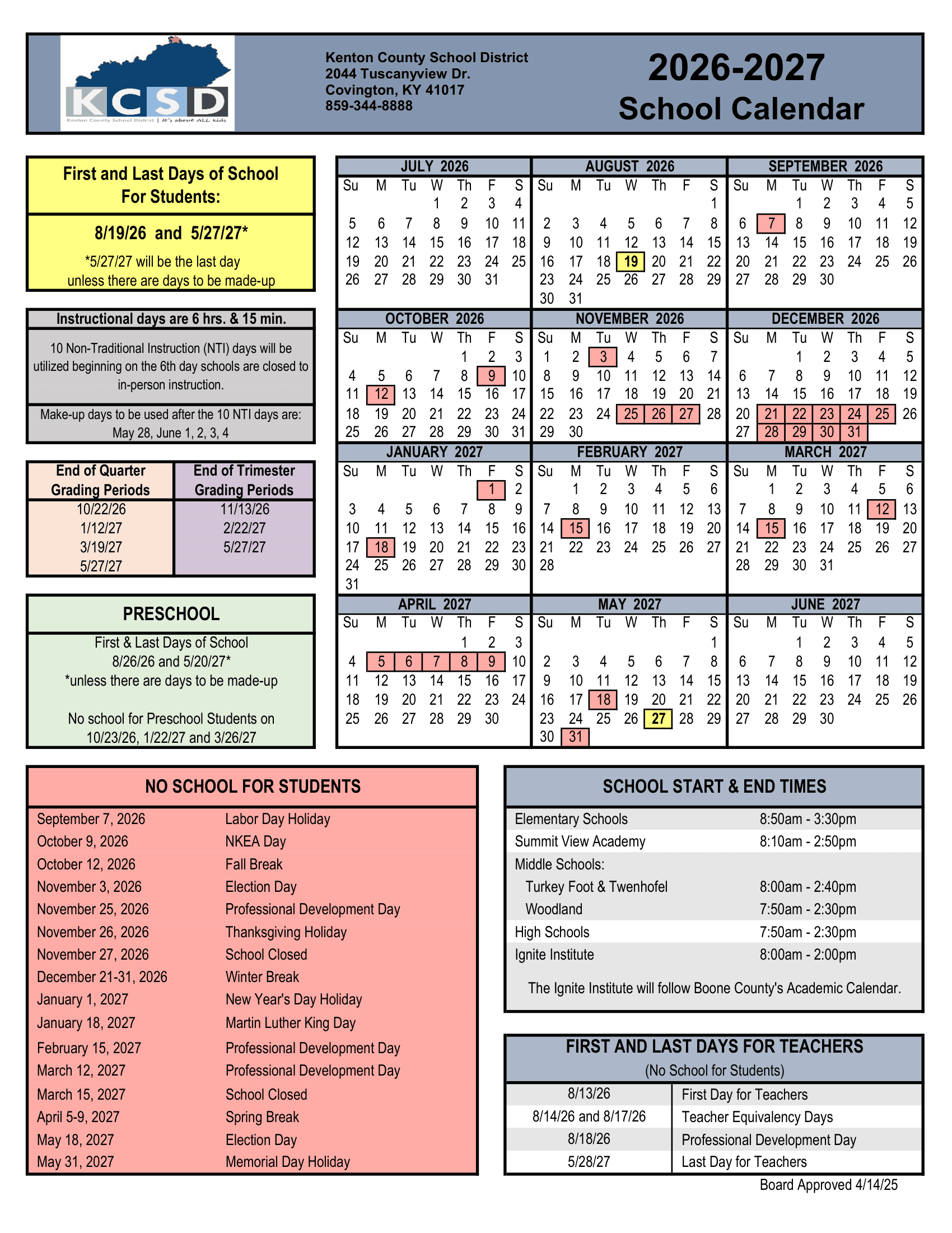 Dates are sourced from the official Kenton County School District KCSD ky 26-27 Calendar Updates[PDF] website. Dates may change at the discretion of the district. Always verify with the official school website for the latest updates.