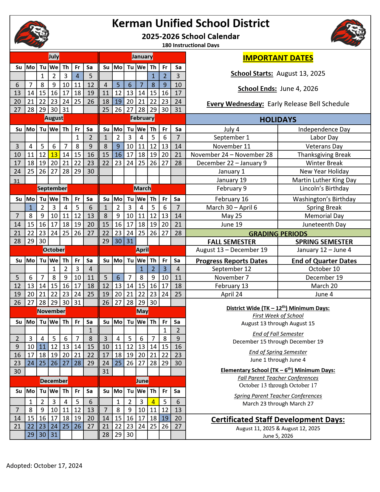 The school calendar provided on this page is taken from the official kerman Unified School District website. Please note that all dates and events are subject to change at the discretion of the school district. For the most accurate and updated information, please refer to the official district website or contact the school helpline.