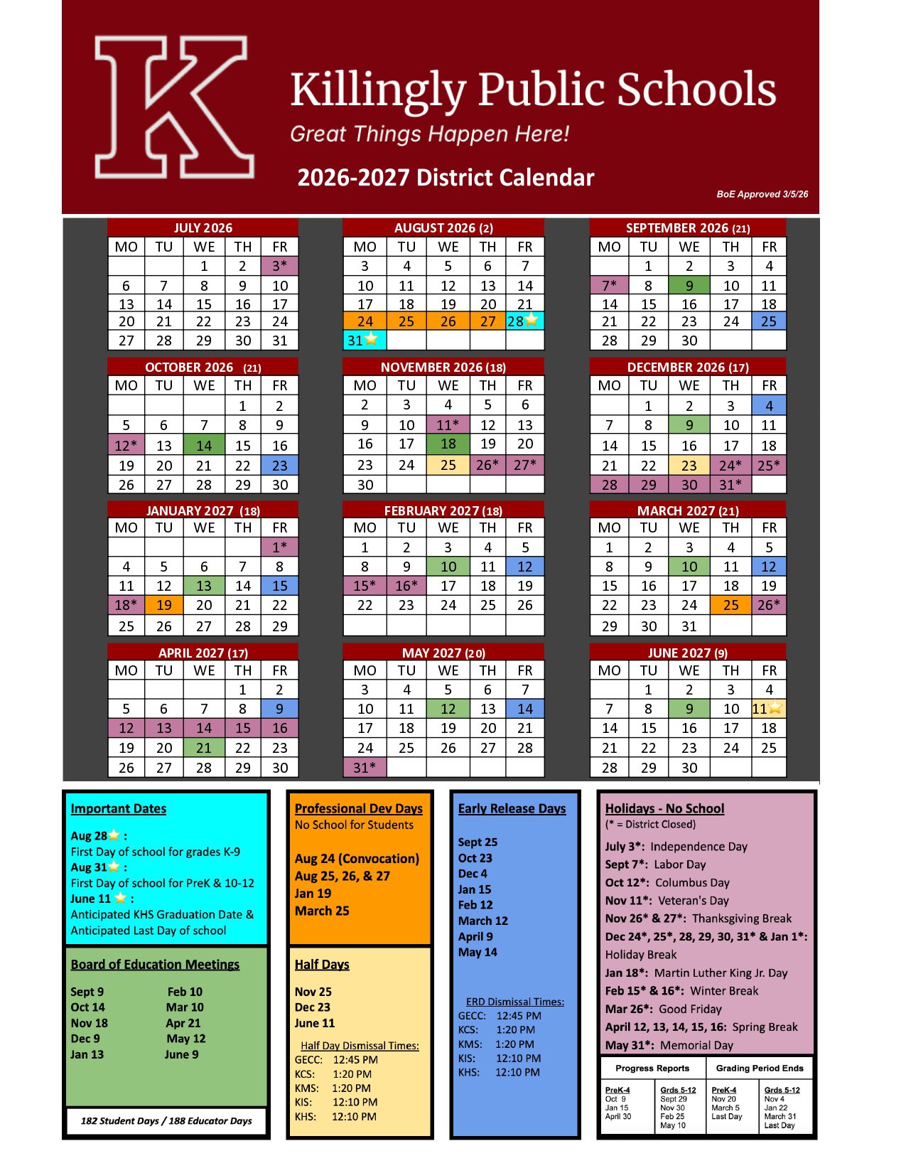Killingly Public Schools Calendar (2026-2027)