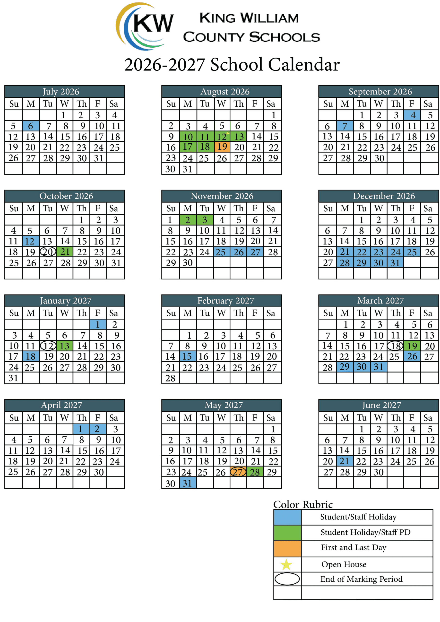 The Printable school calendar provided on this page is taken from the official King William County Schools VA Calendar 26-27 PDF. Please note that all dates and events are subject to change at the discretion of the school district. For the most accurate and updated information, please refer to the official district website or contact the school helpline.