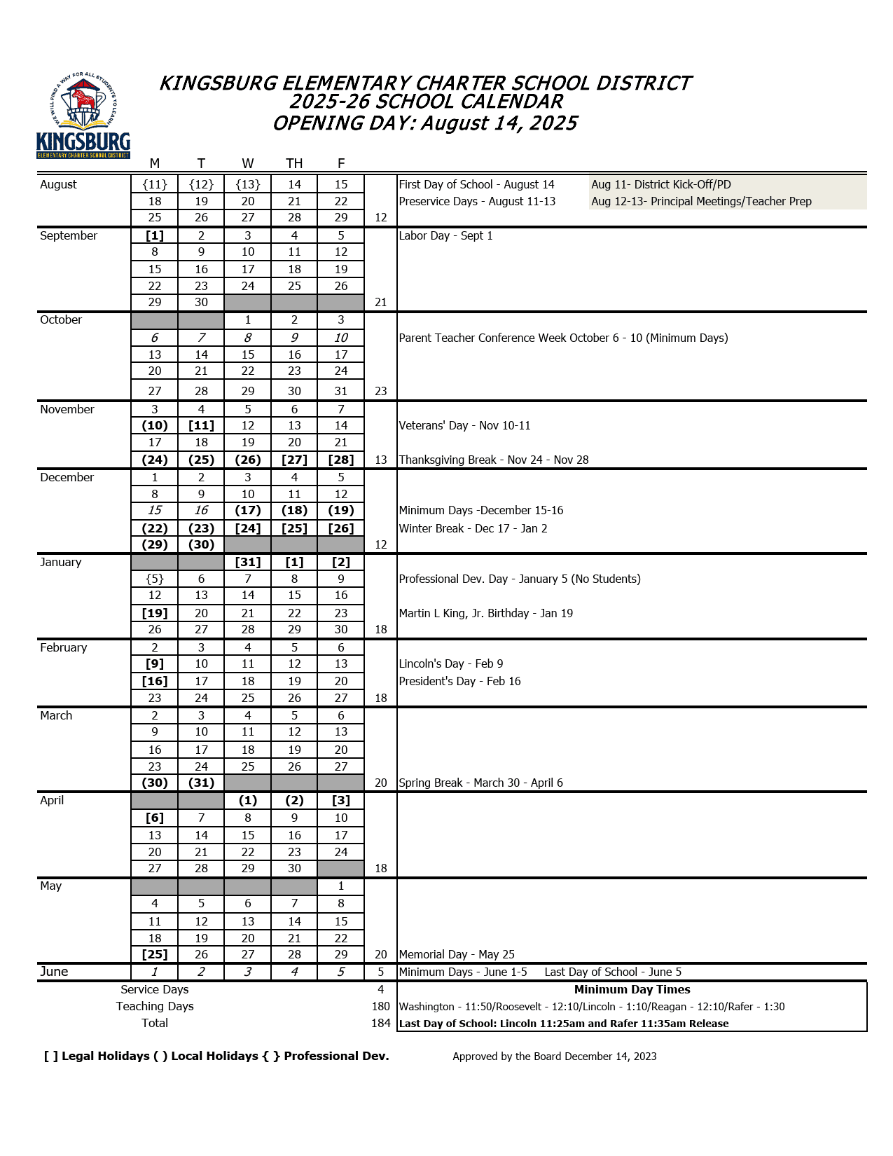 The school calendar provided on this page is taken from the official KECSD Kingsburg Elementary Charter School District website. Please note that all dates and events are subject to change at the discretion of the school district. For the most accurate and updated information, please refer to the official district website or contact the school helpline.