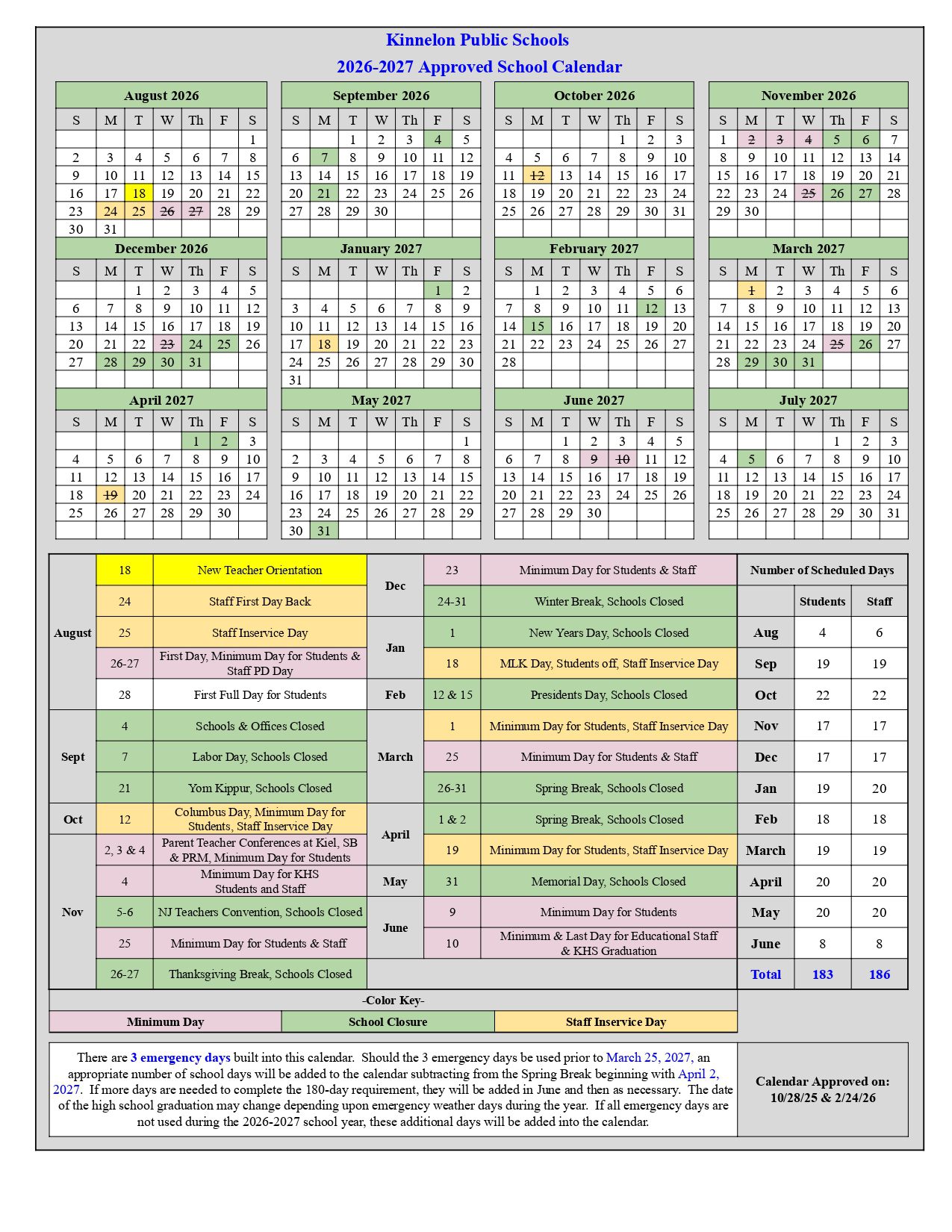 Kinnelon Public Schools NJ Calendar  26-27 Updates