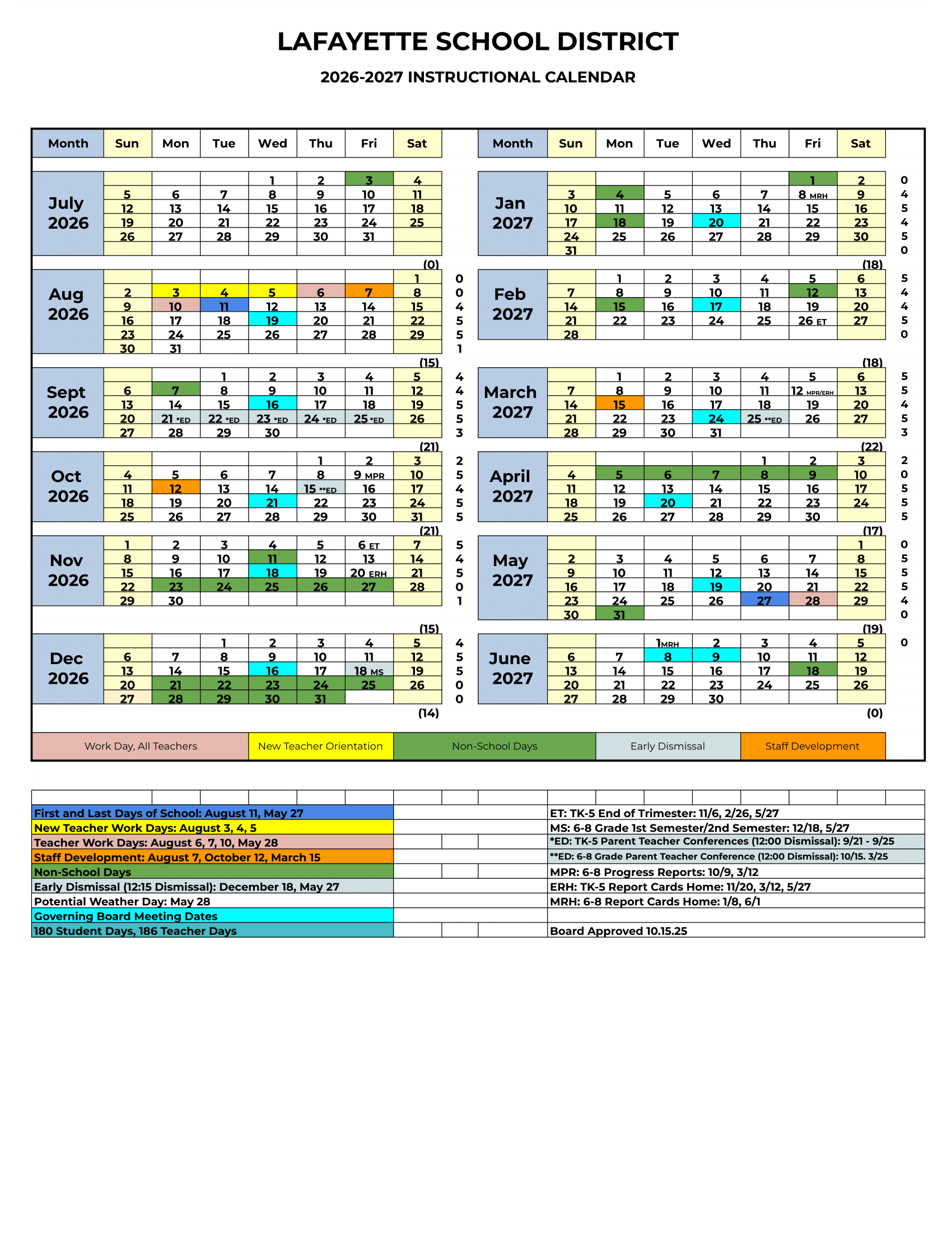 The school Term Dates shown on this page has been sourced directly from the official Lafayette School District Calendar 26-27 Revised PDF website. Please be aware that all dates and events may be amended at the discretion of the school, state, District or County. For the most up-to-date and accurate information, we recommend checking the official council website or contacting the school office.