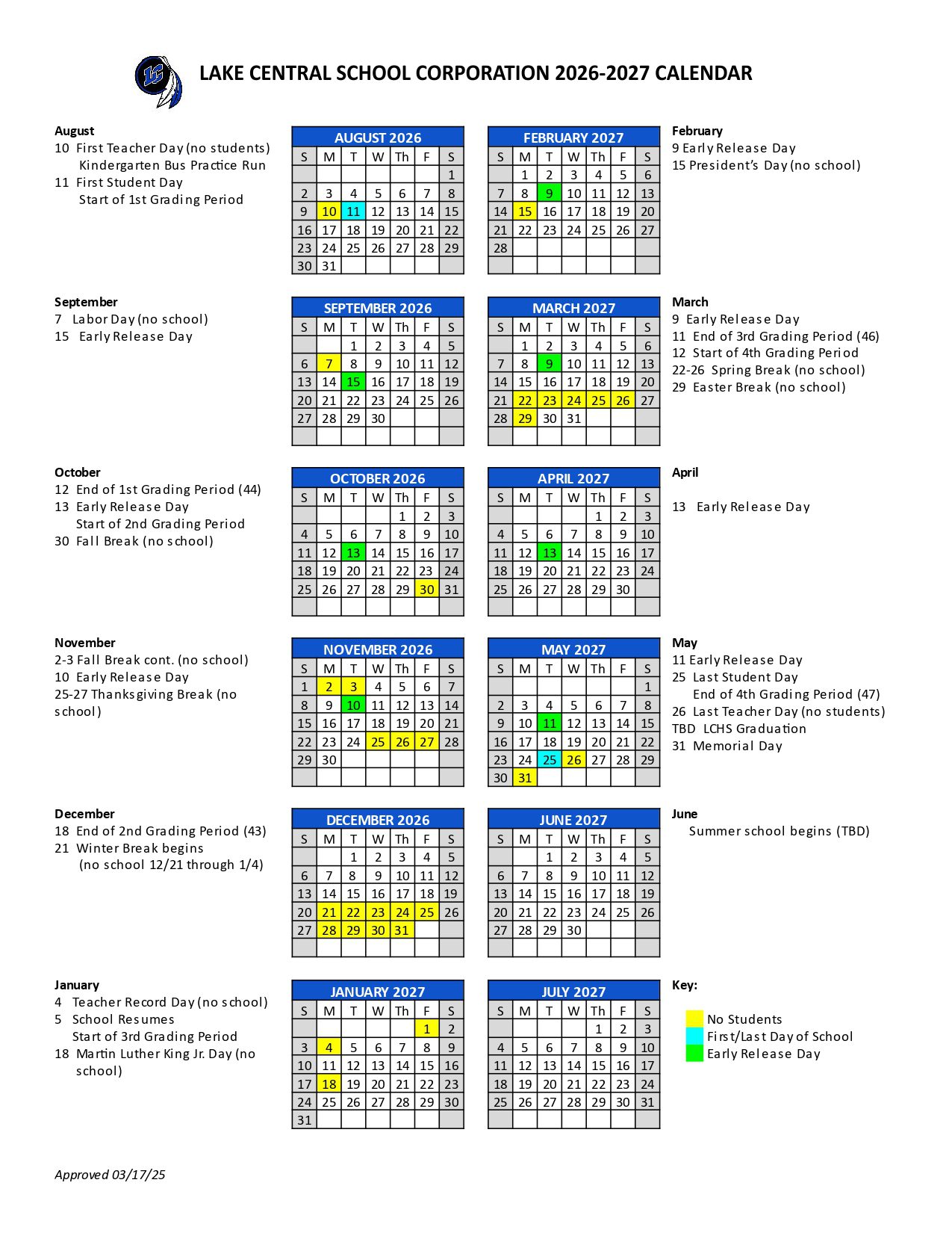 Dates are sourced from the official Lake Central School Corporation Calendar 26-27 [PDF] website. Dates may change at the discretion of the district. Always verify with the official school website for the latest updates.