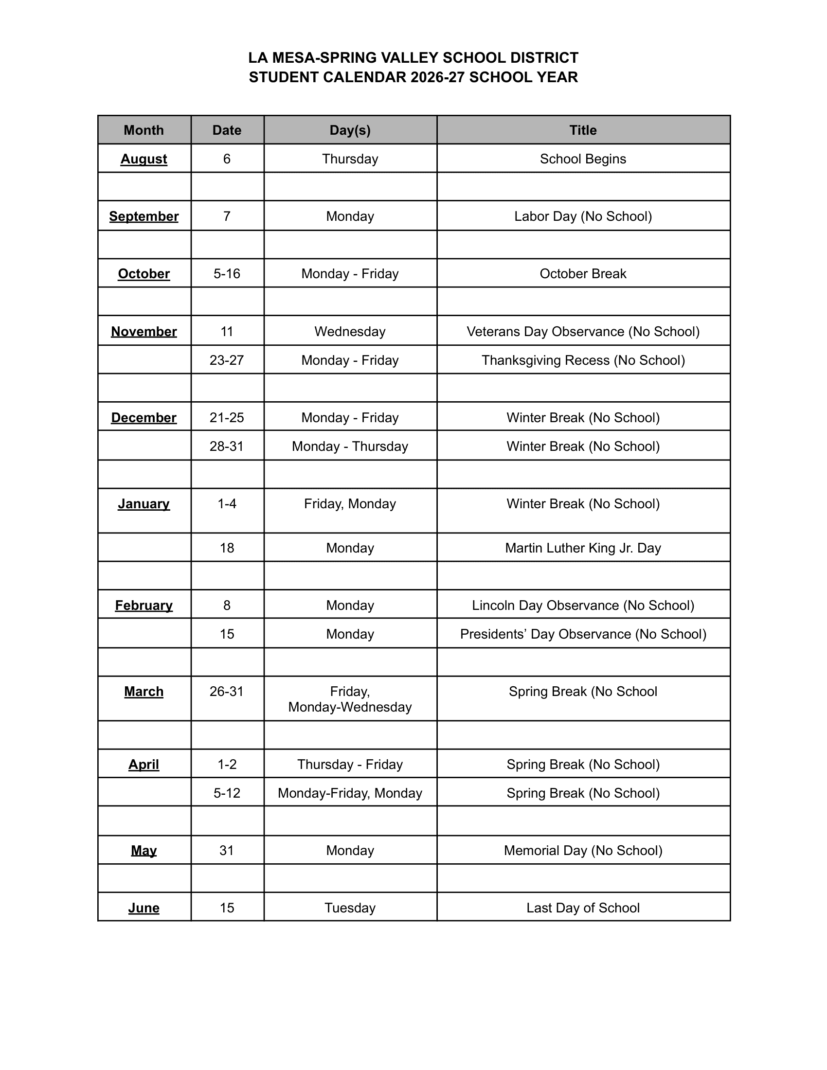 Dates are sourced from the official Lakeside Union School District 26-27 Calendar [PDF] website. Dates may change at the discretion of the district. Always verify with the official school website for the latest updates.