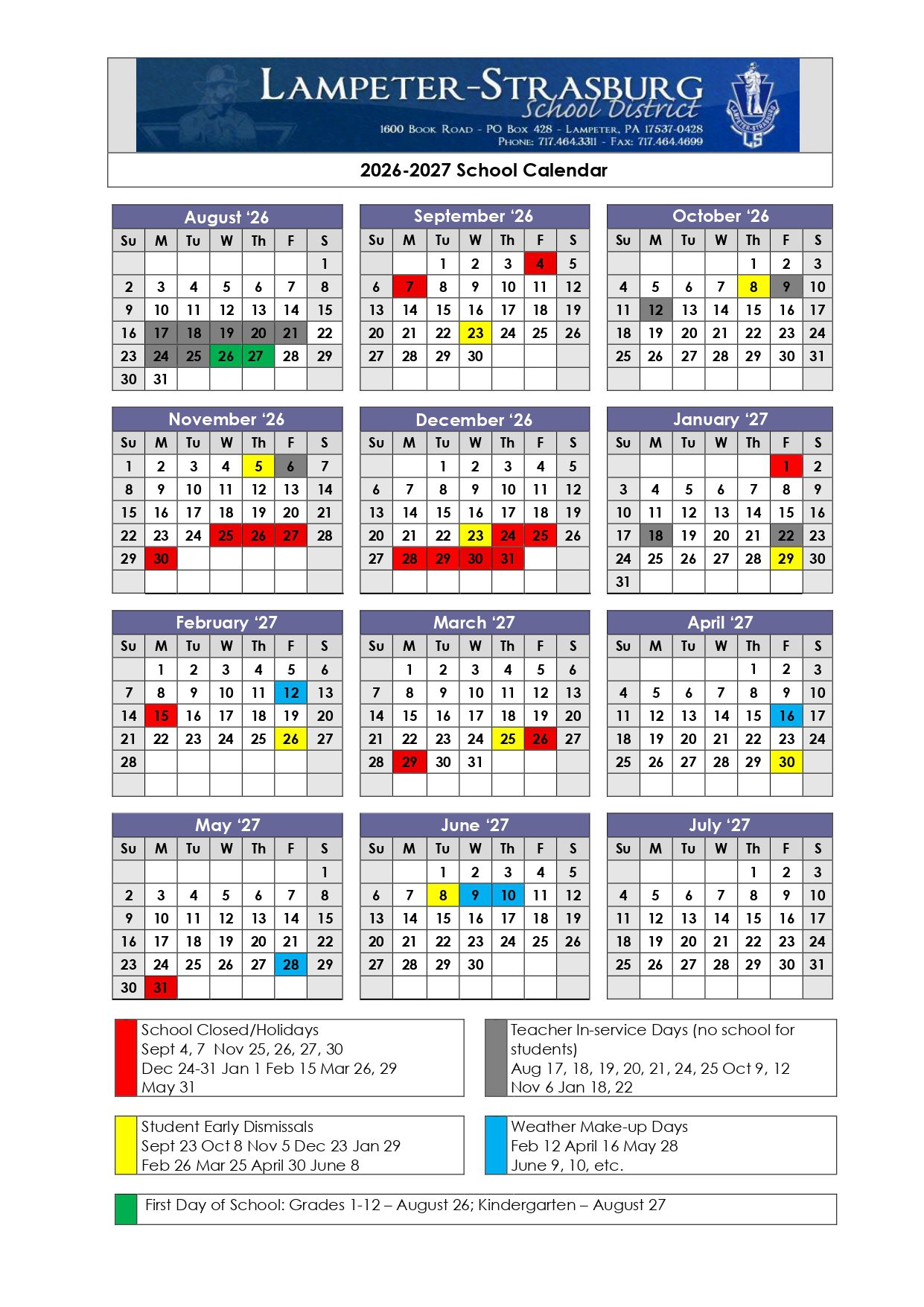 Lampeter-Strasburg School District Calendar (2026-2027)