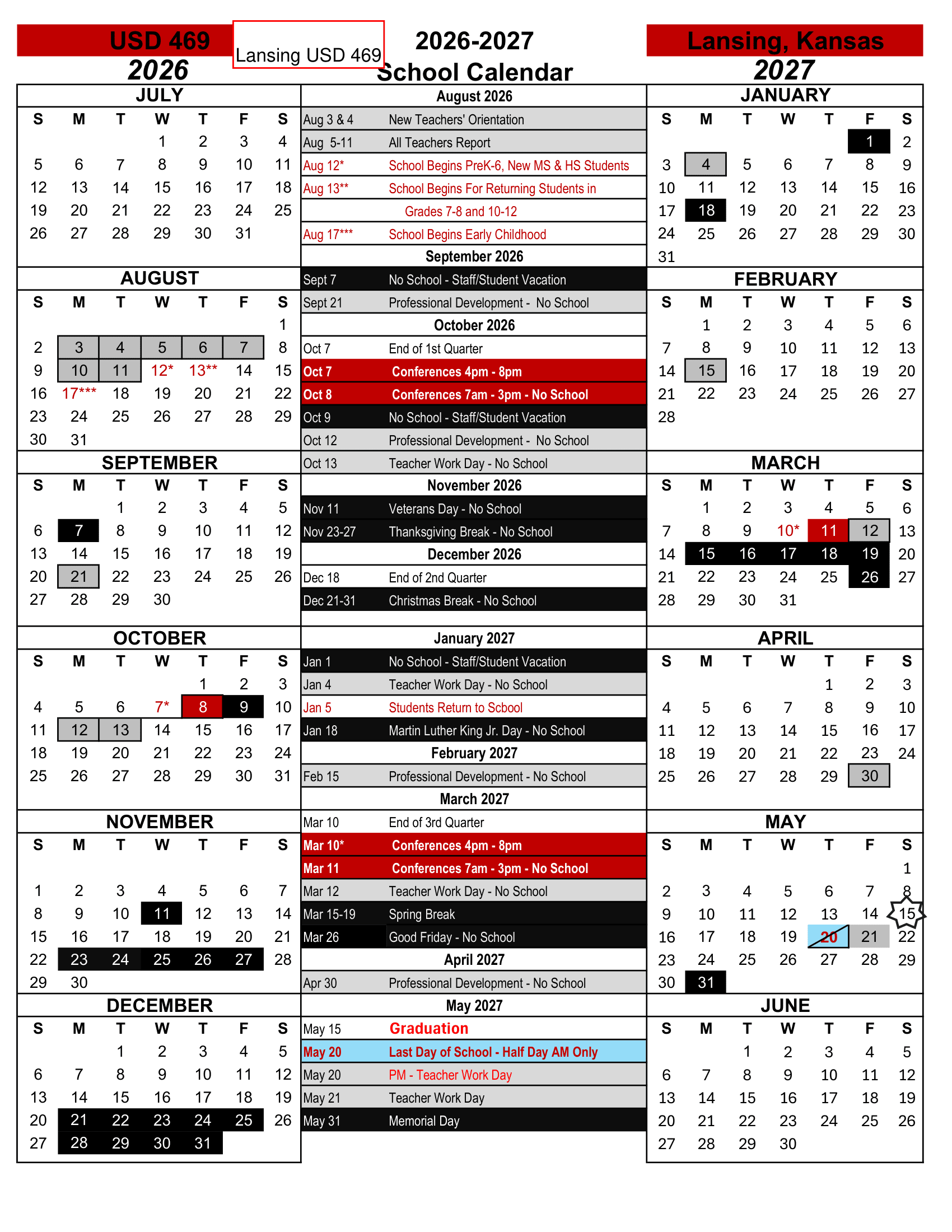 Dates are sourced from the official Lansing USD 469 26-27 Calendar Updated website. Dates may change at the discretion of the district. Always verify with the official school website for the latest updates.