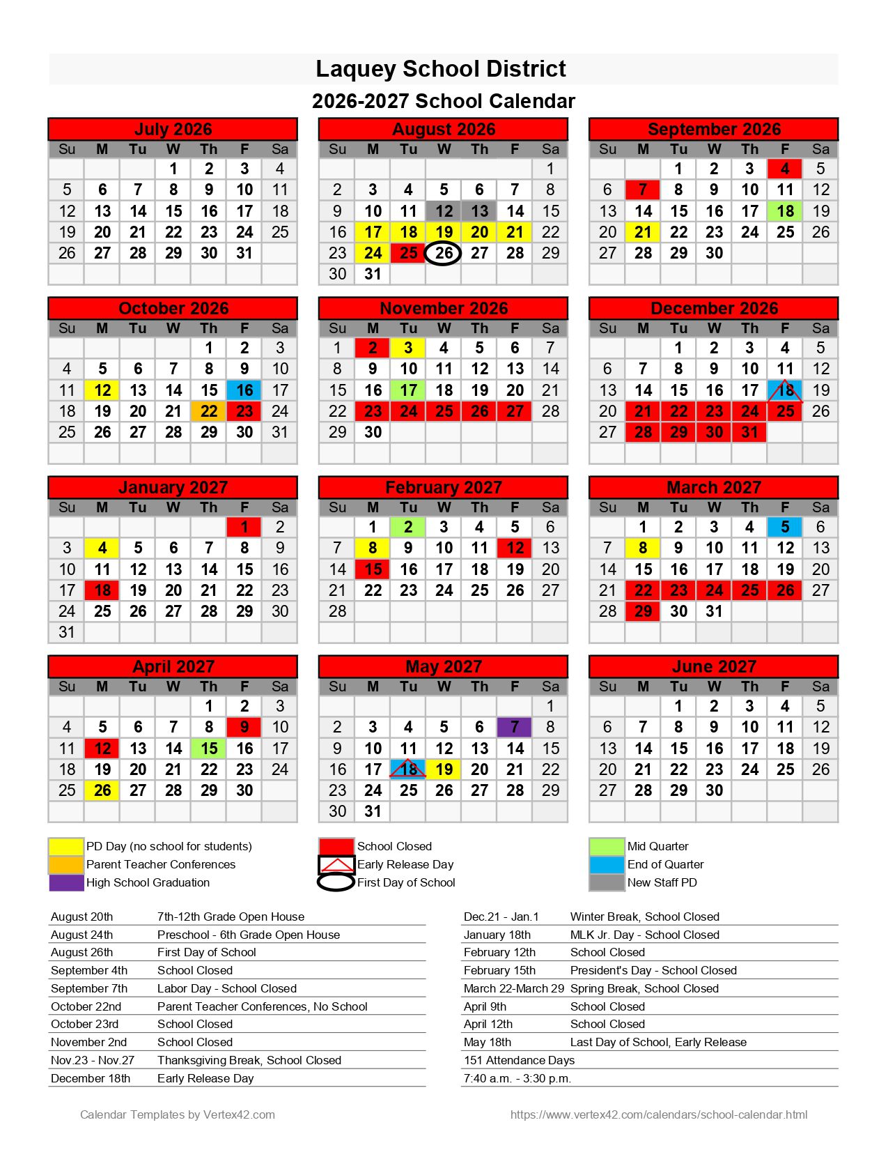 The Printable school calendar provided on this page is taken from the official Laquey School District Calendar 26-27 Updated. Please note that all dates and events are subject to change at the discretion of the school district. For the most accurate and updated information, please refer to the official district website or contact the school helpline.