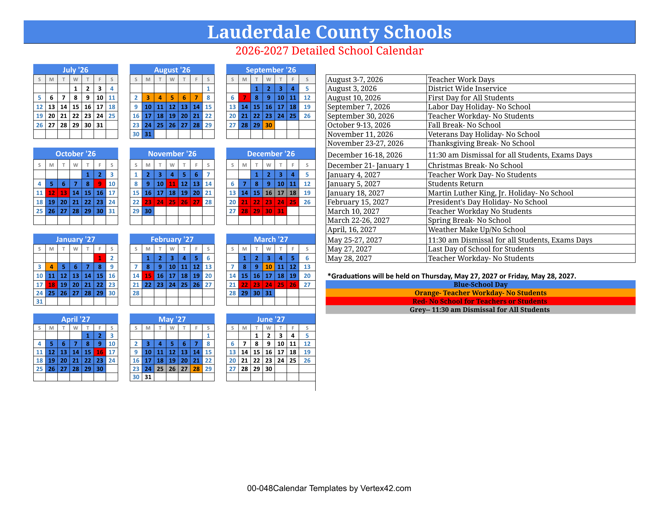 Dates are sourced from the official Lauderdale County Schools 26-27 Calendar Revised website. Dates may change at the discretion of the district. Always verify with the official school website for the latest updates.