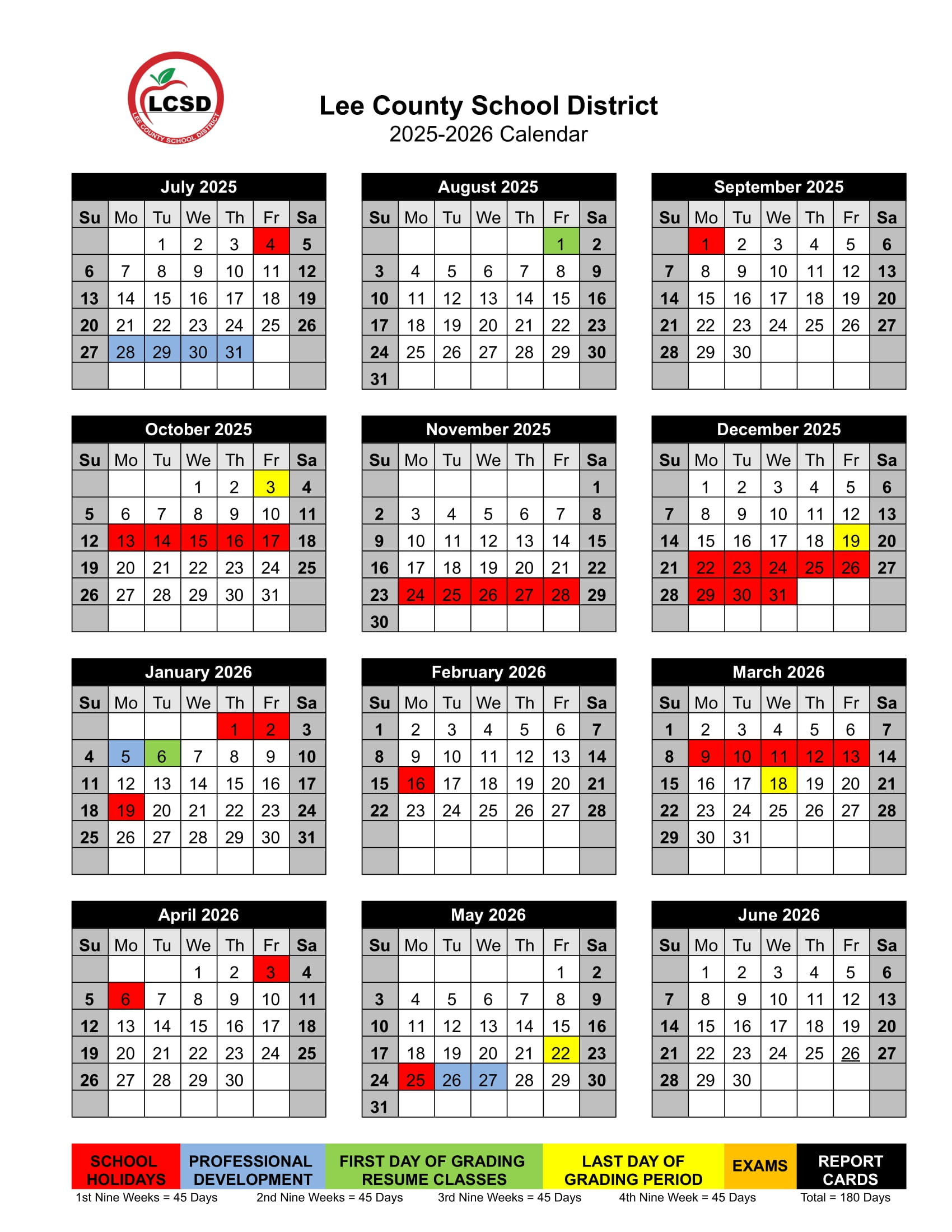 The printable school calendar provided on this page is taken from the official Lee County School District Calendar website. Please note that all dates and events are subject to change at the discretion of the school district. For the most accurate and updated information, please refer to the official district website or contact the school helpline.