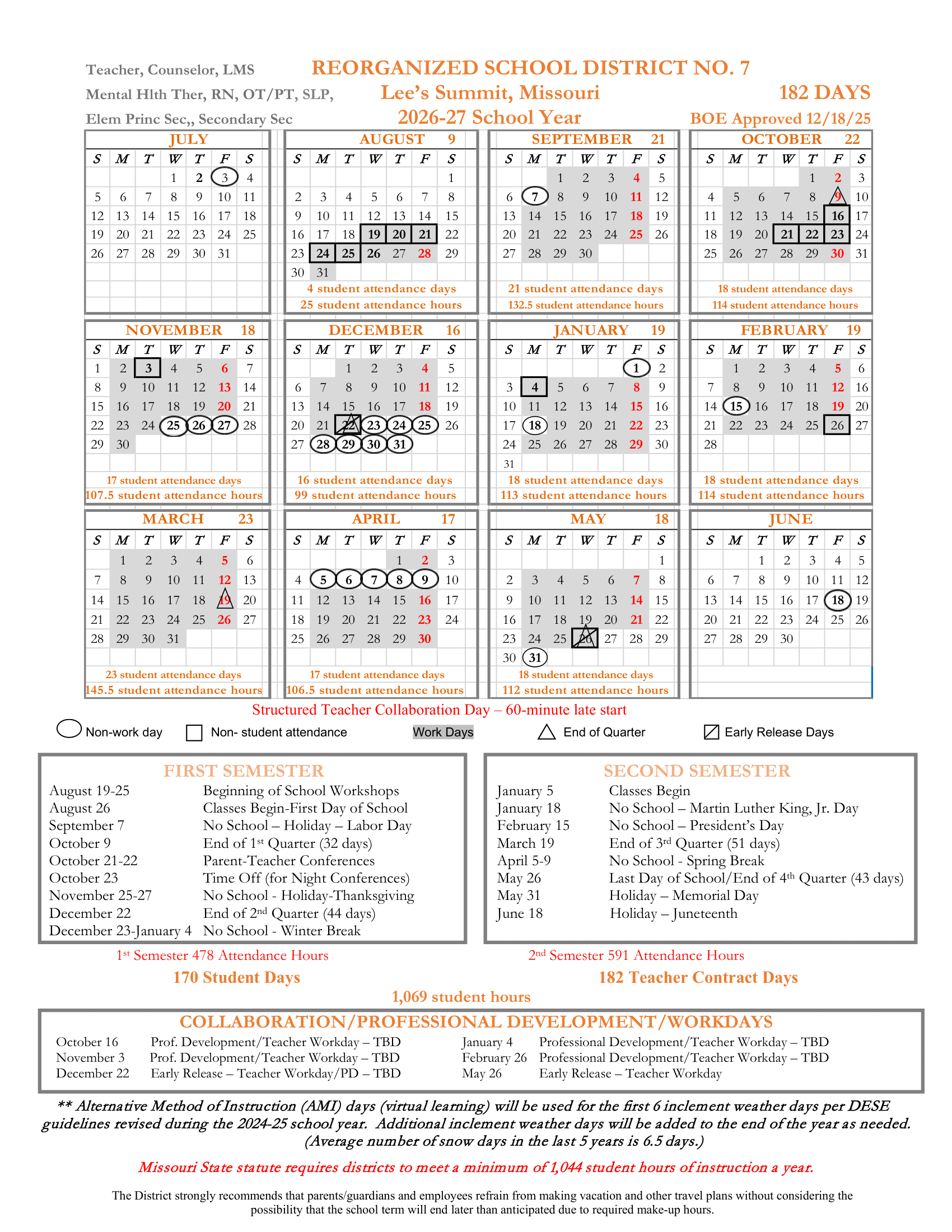 Reorganized School District No. 7, Lee’s Summit, Missouri School Calendar (2026-2027)