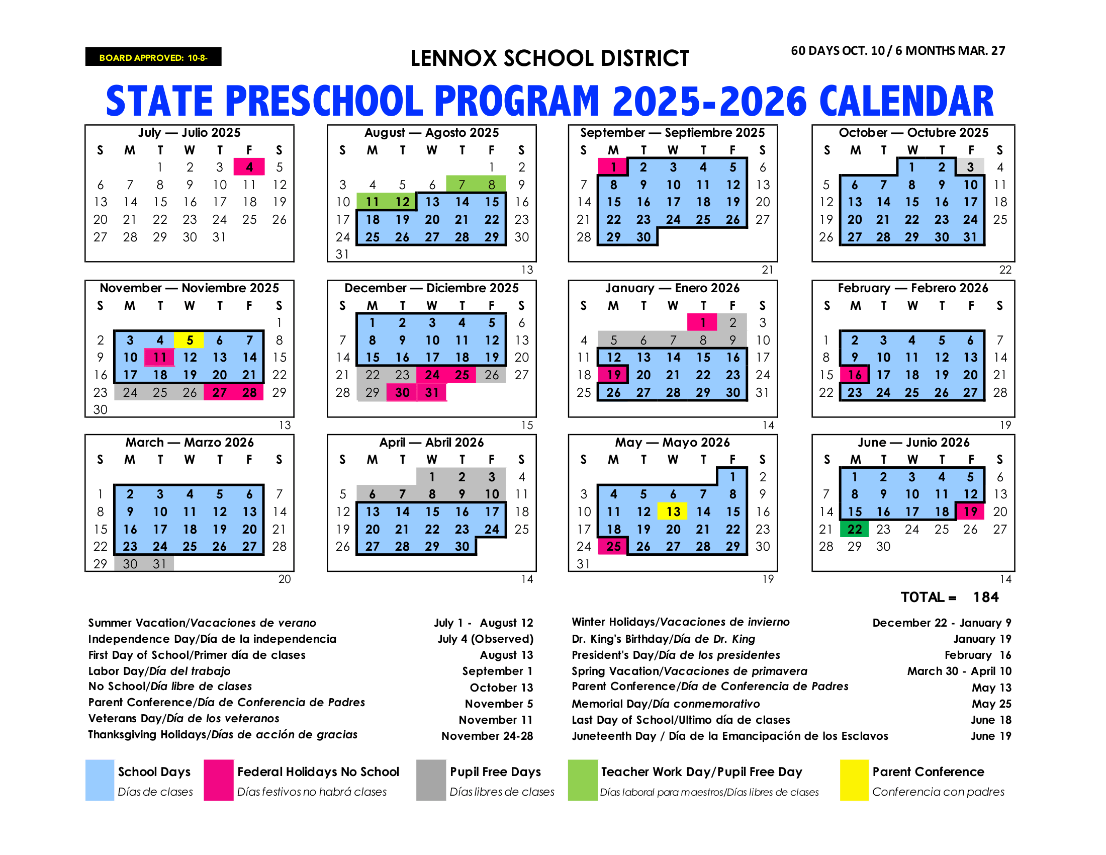 Dates are sourced from the official Lennox School District 26-27 Calender [PDF] website. Dates may change at the discretion of the district. Always verify with the official school website for the latest updates.