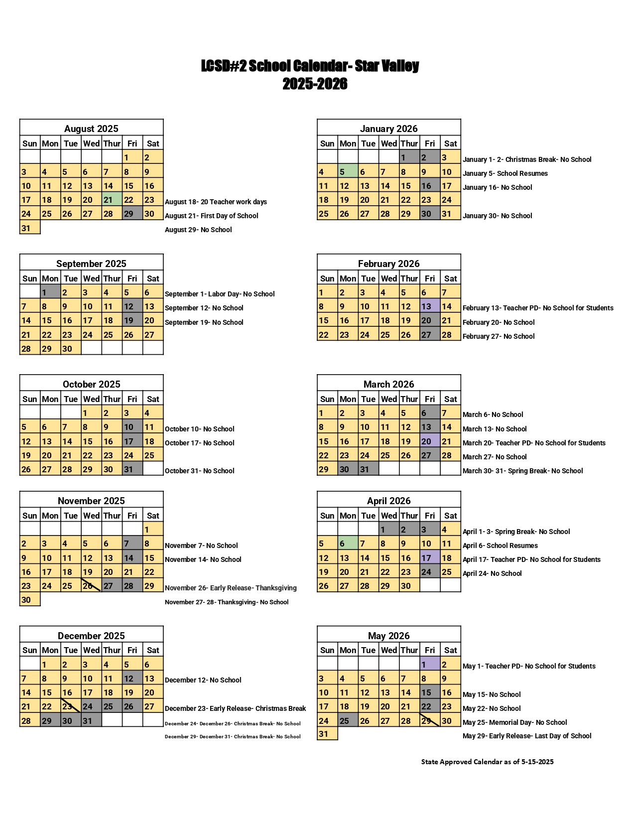 LCSD#2 School Calendar-Star Valley Calendar (2025-2026)