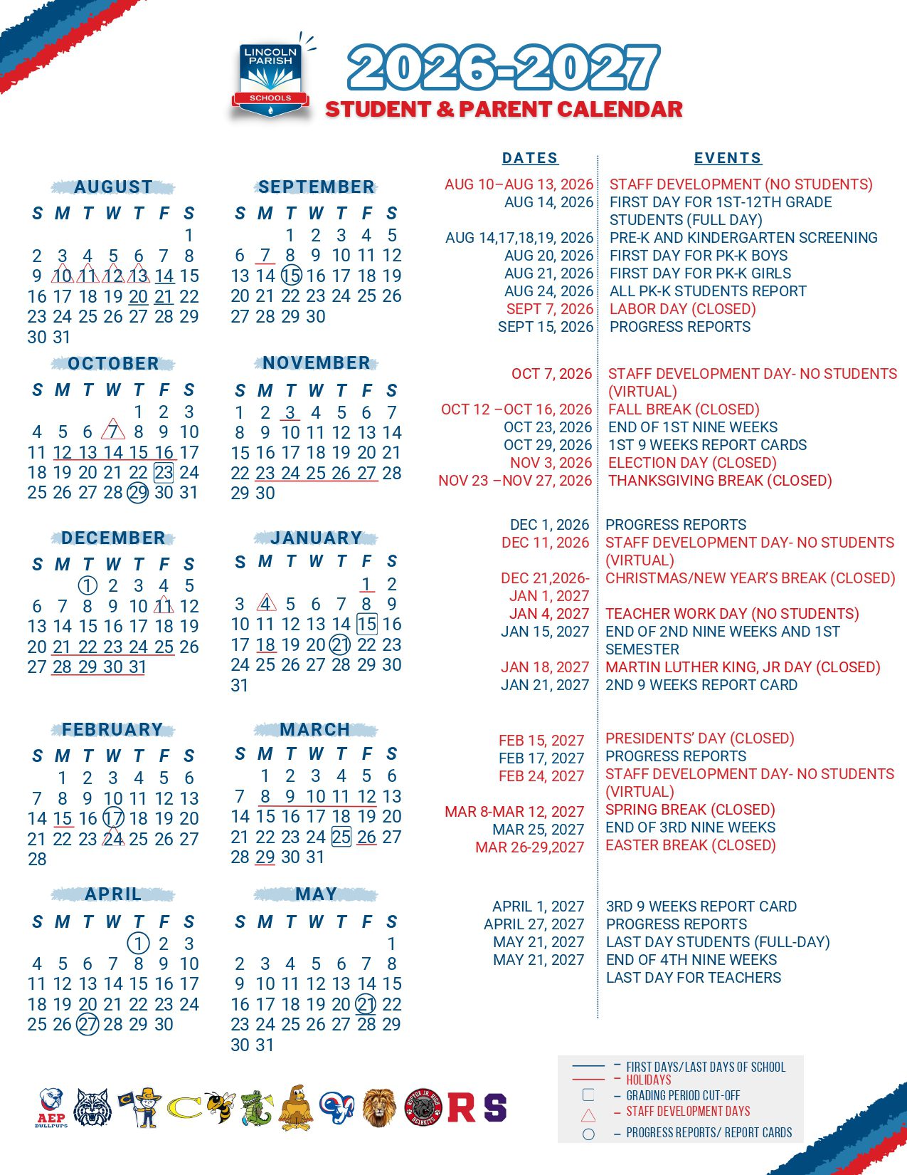 Dates are sourced from the official LINCOLN PARISH SCHOOLS Calendar 26-27 Revised [PDF] website. Dates may change at the discretion of the district. Always verify with the official school website for the latest updates.