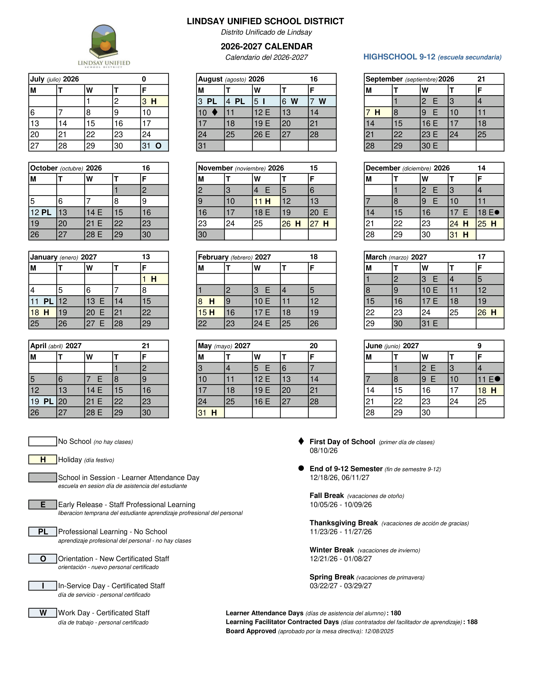 Lindsay Unified School District Calendar (2026-2027)