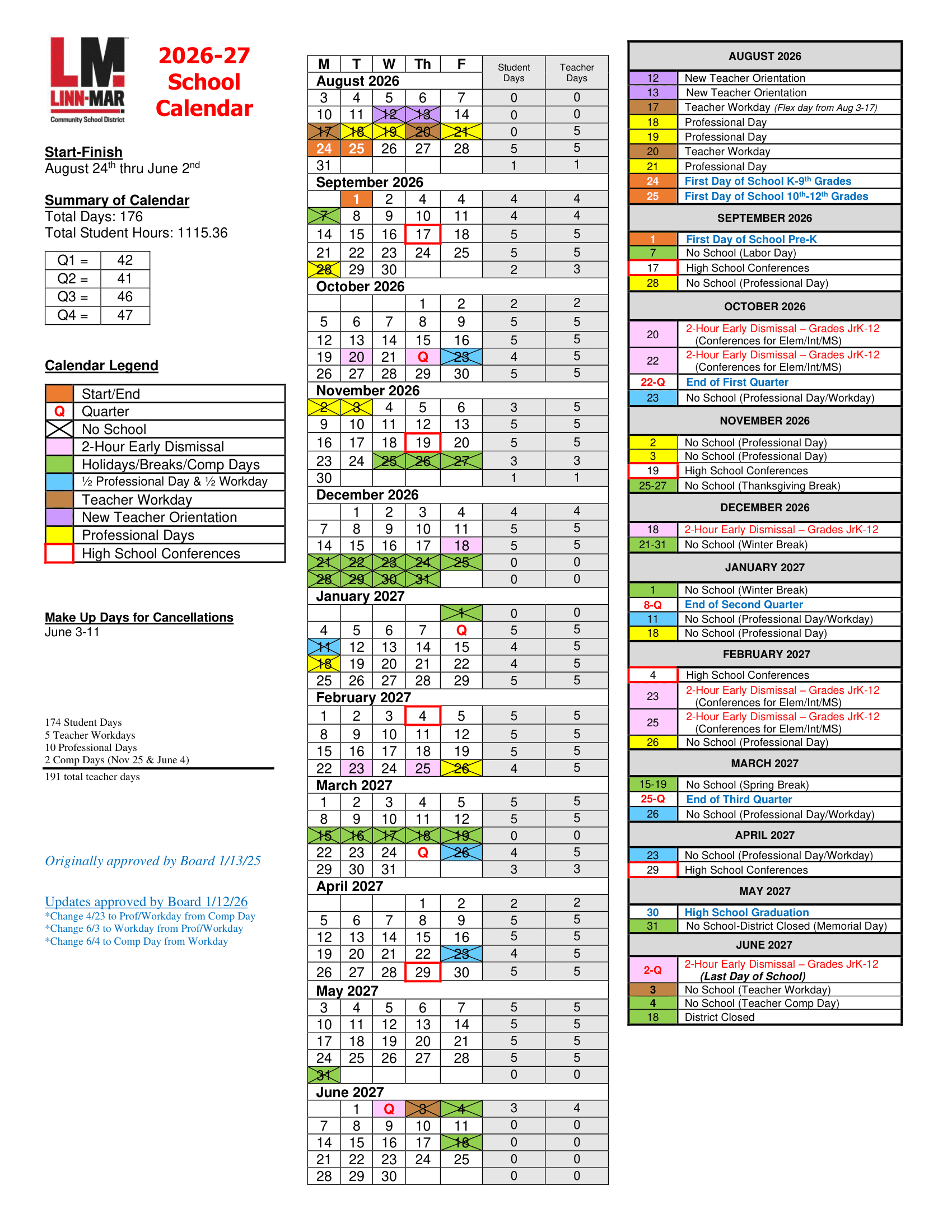 Dates are sourced from the official Linn-Mar Community School District 26-27 Calendar Revised [PDF] website. Dates may change at the discretion of the district. Always verify with the official school website for the latest updates.