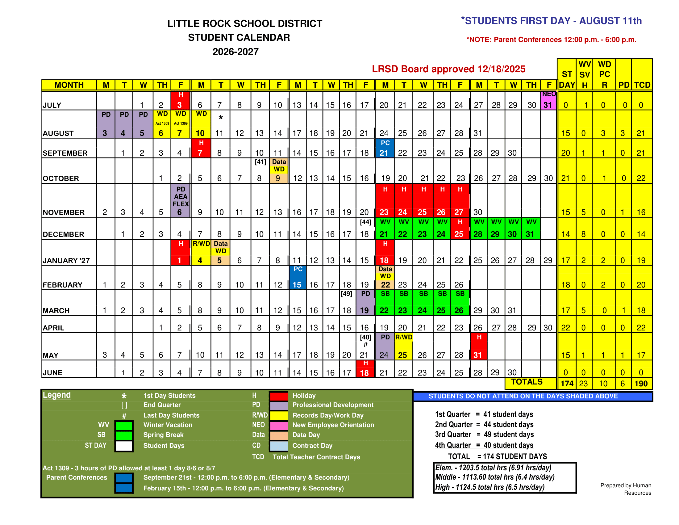 Dates are sourced from the official LITTLE ROCK SCHOOL DISTRICT 26-27 Calendar Updated [PDF] website. Dates may change at the discretion of the district. Always verify with the official school website for the latest updates.