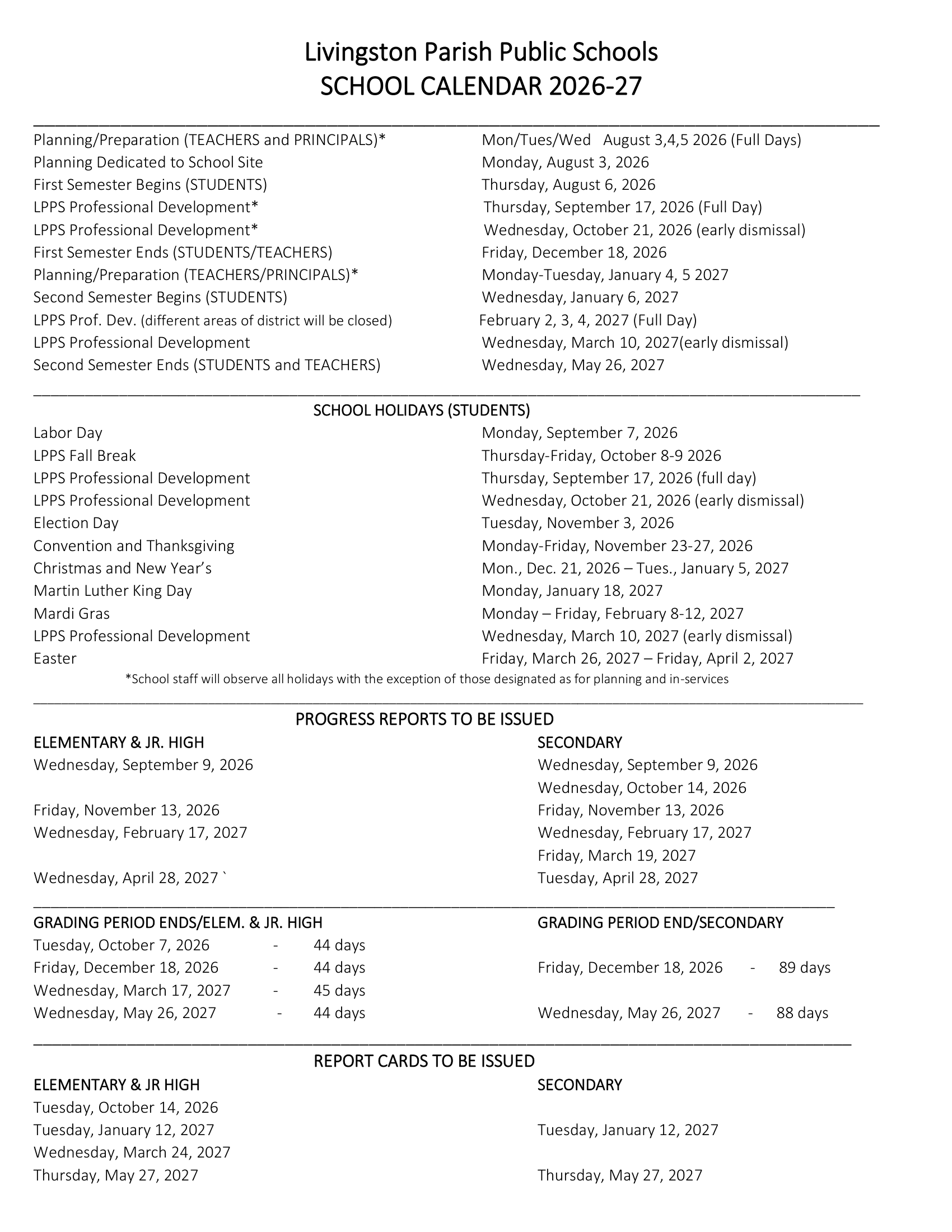 Dates are sourced from the official Livingston Parish Public Schools Calendar 26-27 Revised [PDF] website. Dates may change at the discretion of the district. Always verify with the official school website for the latest updates.