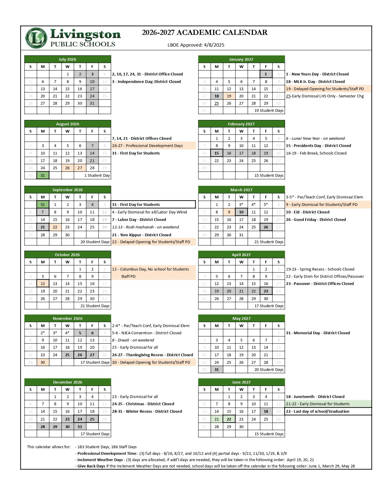 Livingston PUBLIC SCHOOLS Calendar 2026-2027