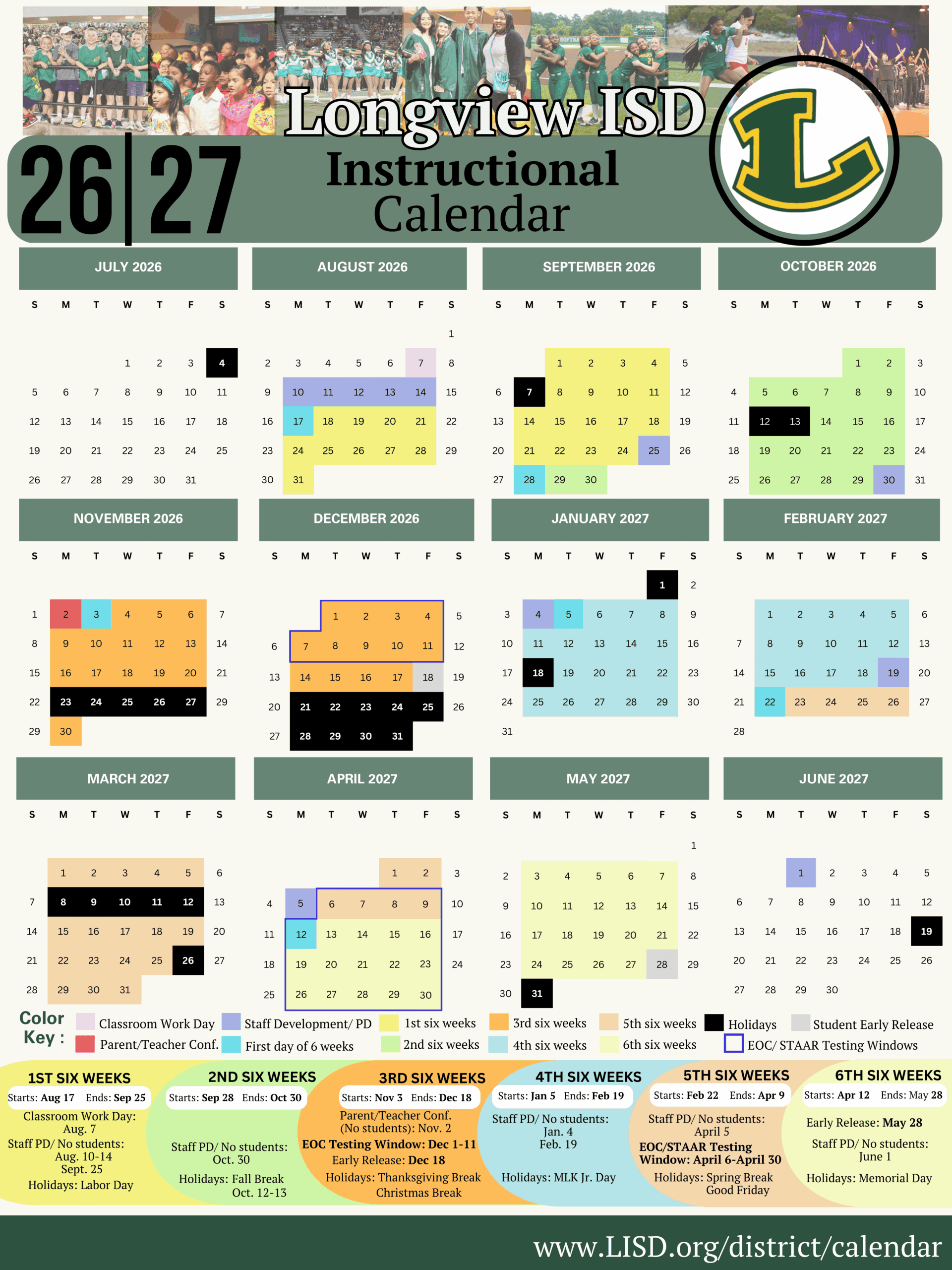 Dates are sourced from the official Longview ISD 26-27 Calendar [PDF] website. Dates may change at the discretion of the district. Always verify with the official school website for the latest updates.