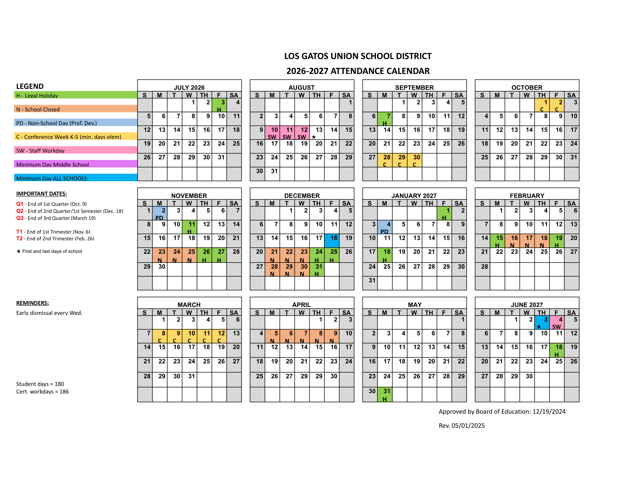 Dates are sourced from the official Los Gatos Union School District 26-27 Calendar [PDF] website. Dates may change at the discretion of the district. Always verify with the official school website for the latest updates.