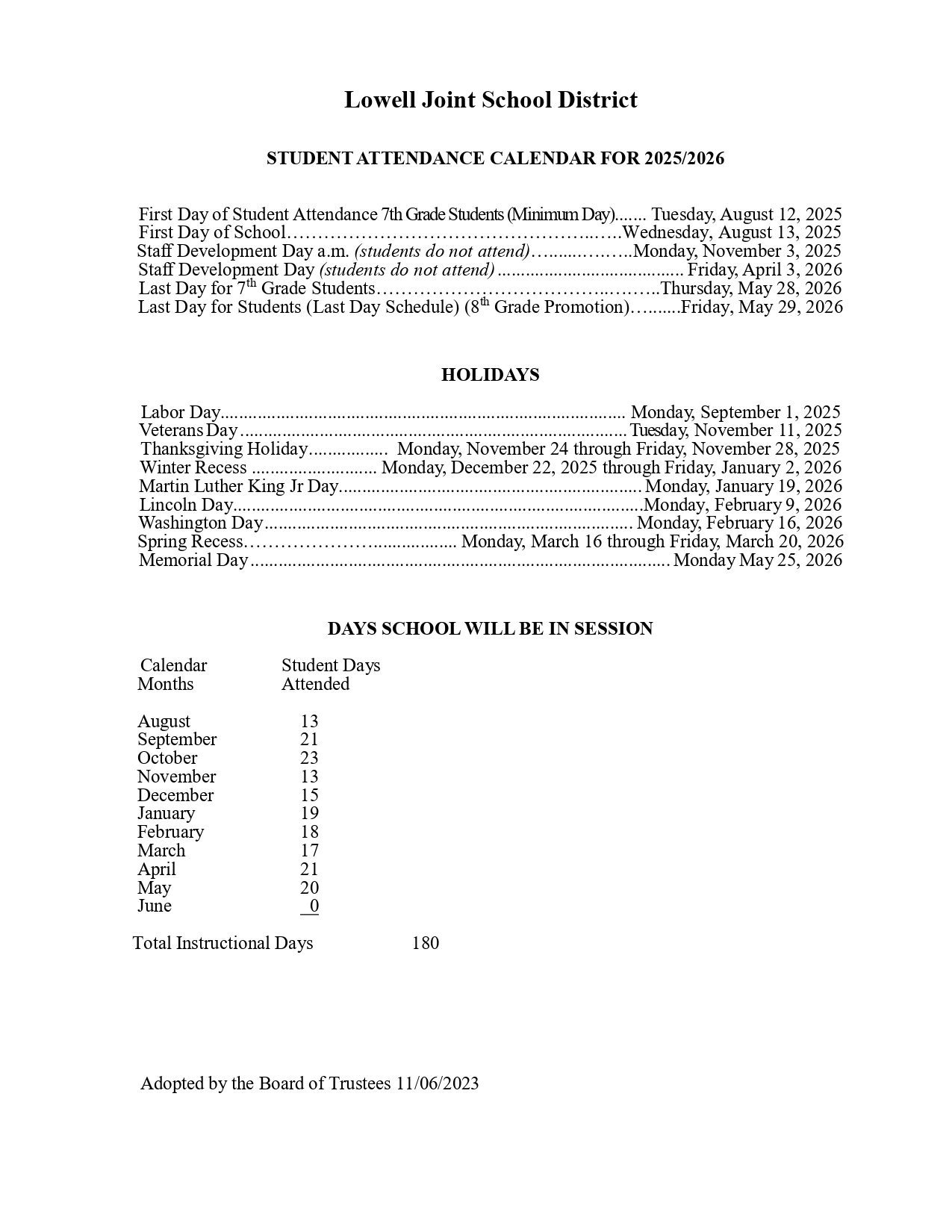 Lowell Joint School District Calendar (2025-2026)