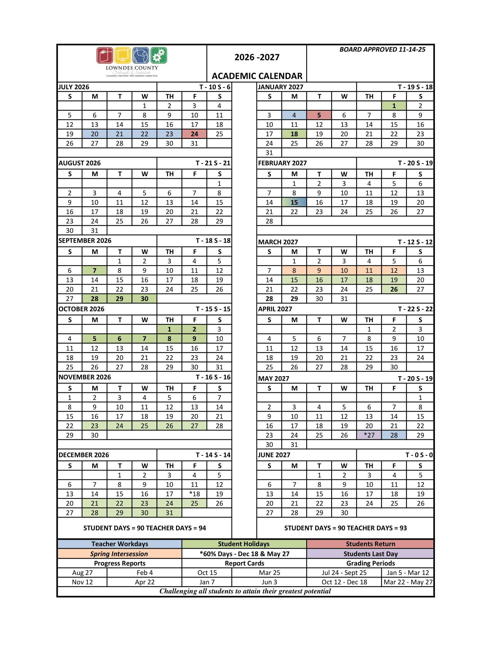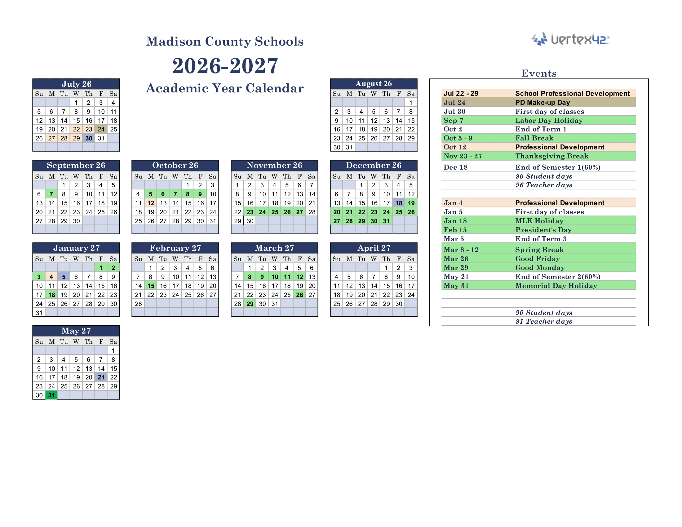 Dates are sourced from the official Madison County Schools ms 26-27 Calendar UPDATED [PDF] website. Dates may change at the discretion of the district. Always verify with the official school website for the latest updates.