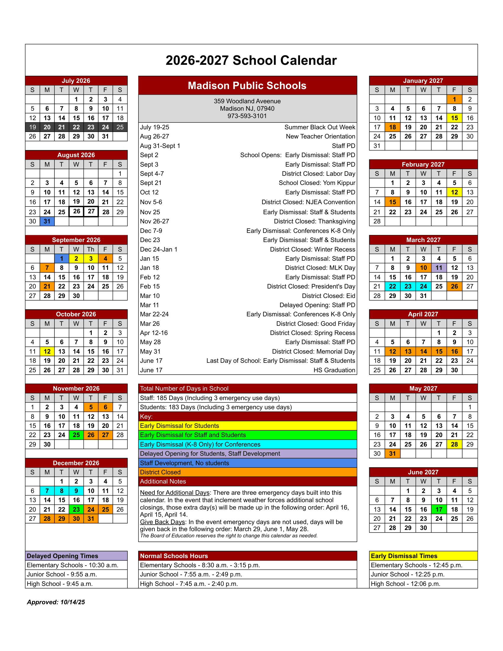 The Printable school calendar provided on this page is taken from the official Madison Public Schools 26-27 Calendar Updates . Please note that all dates and events are subject to change at the discretion of the school district. For the most accurate and updated information, please refer to the official district website or contact the school helpline.