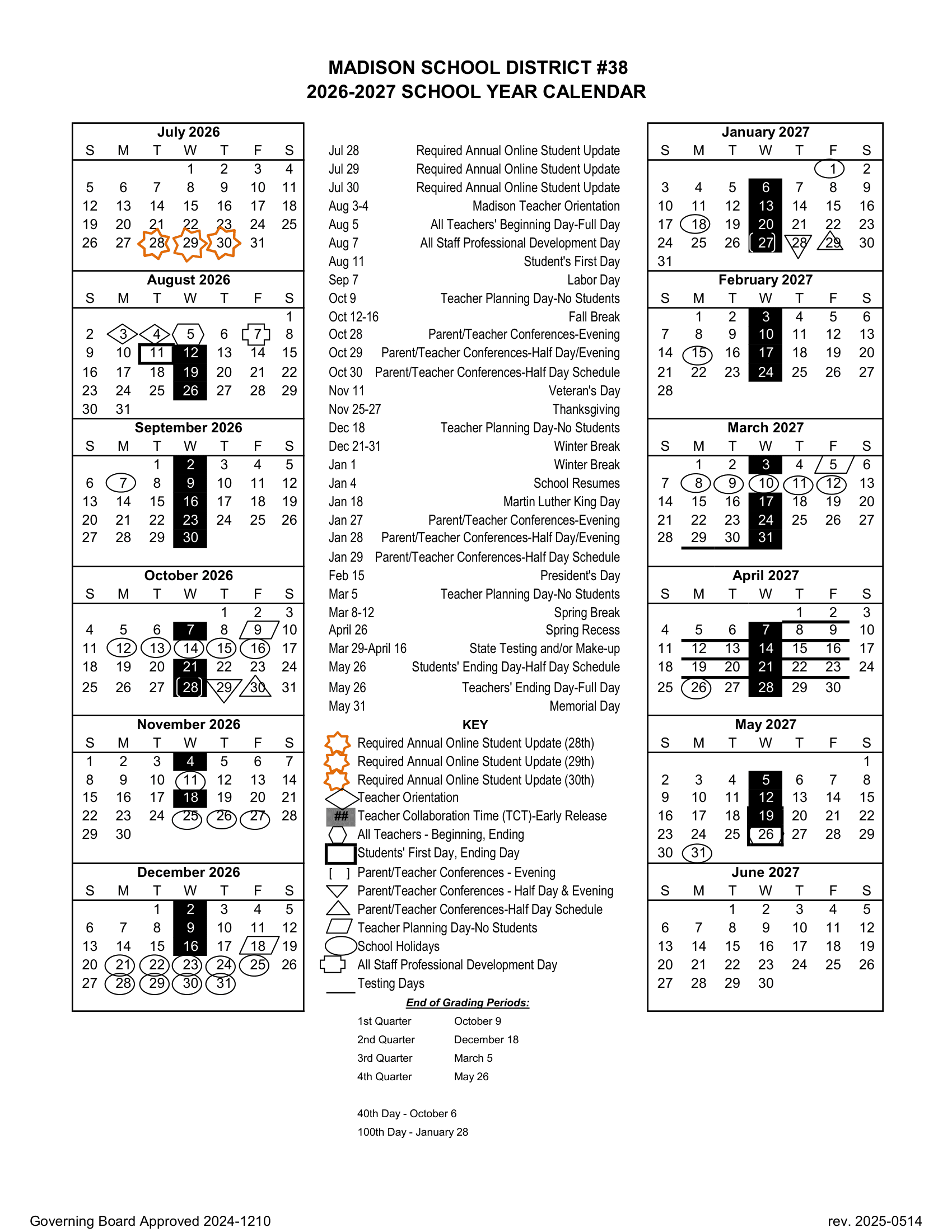 Madison School District #38 Calendar 26-27 Revised Calendar 2026–2027 – Term Dates & School Holidays