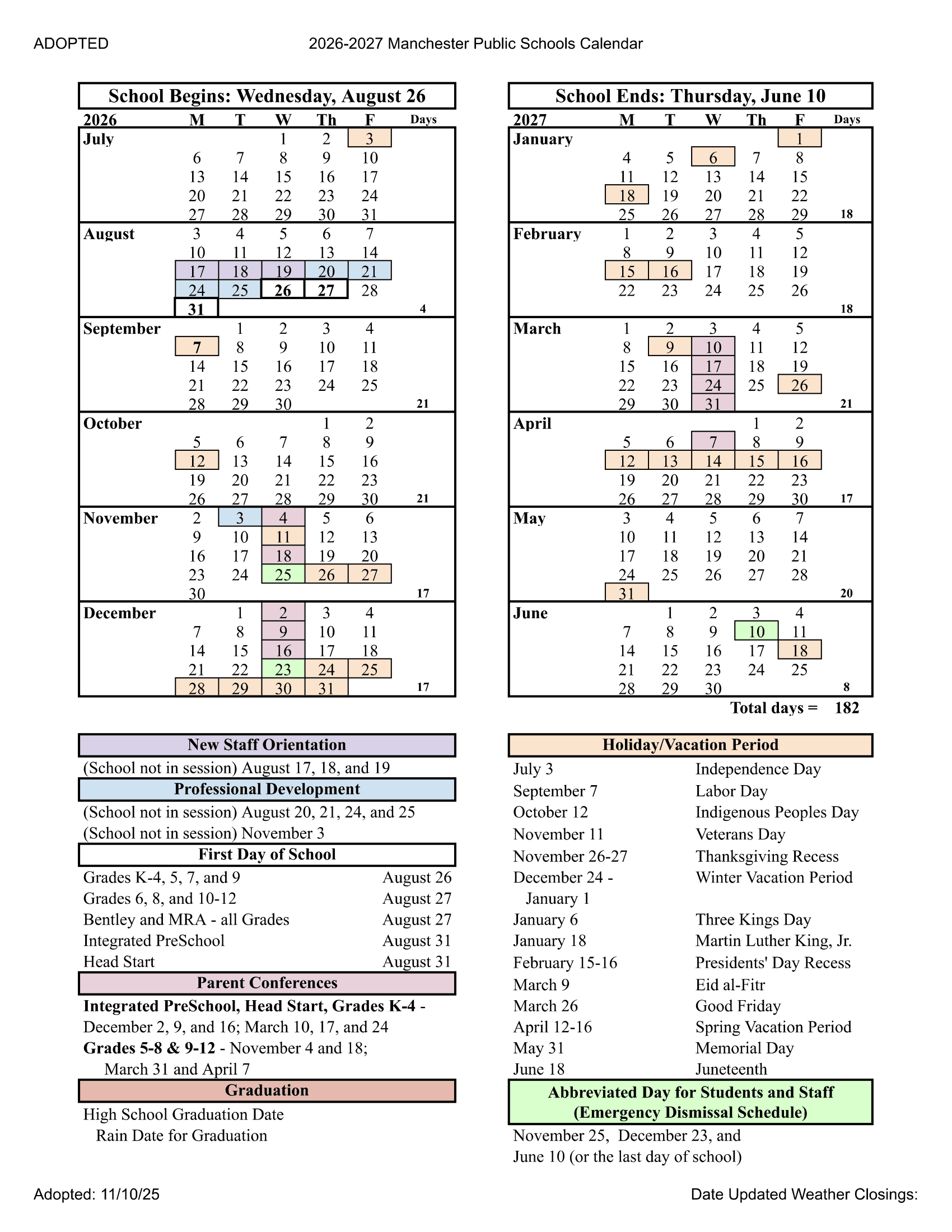 Manchester Public Schools CT 26-27 Calendar Updated [PDF]