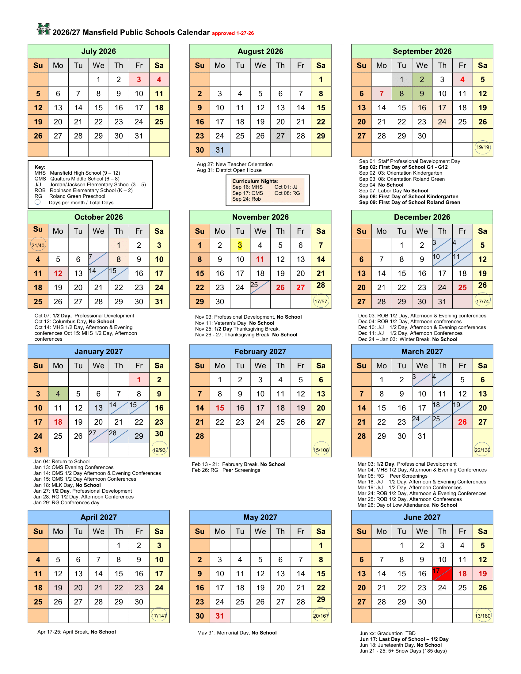 Dates are sourced from the official Mansfield Public Schools 26-27 Calendar Revised [PDF] website. Dates may change at the discretion of the district. Always verify with the official school website for the latest updates.