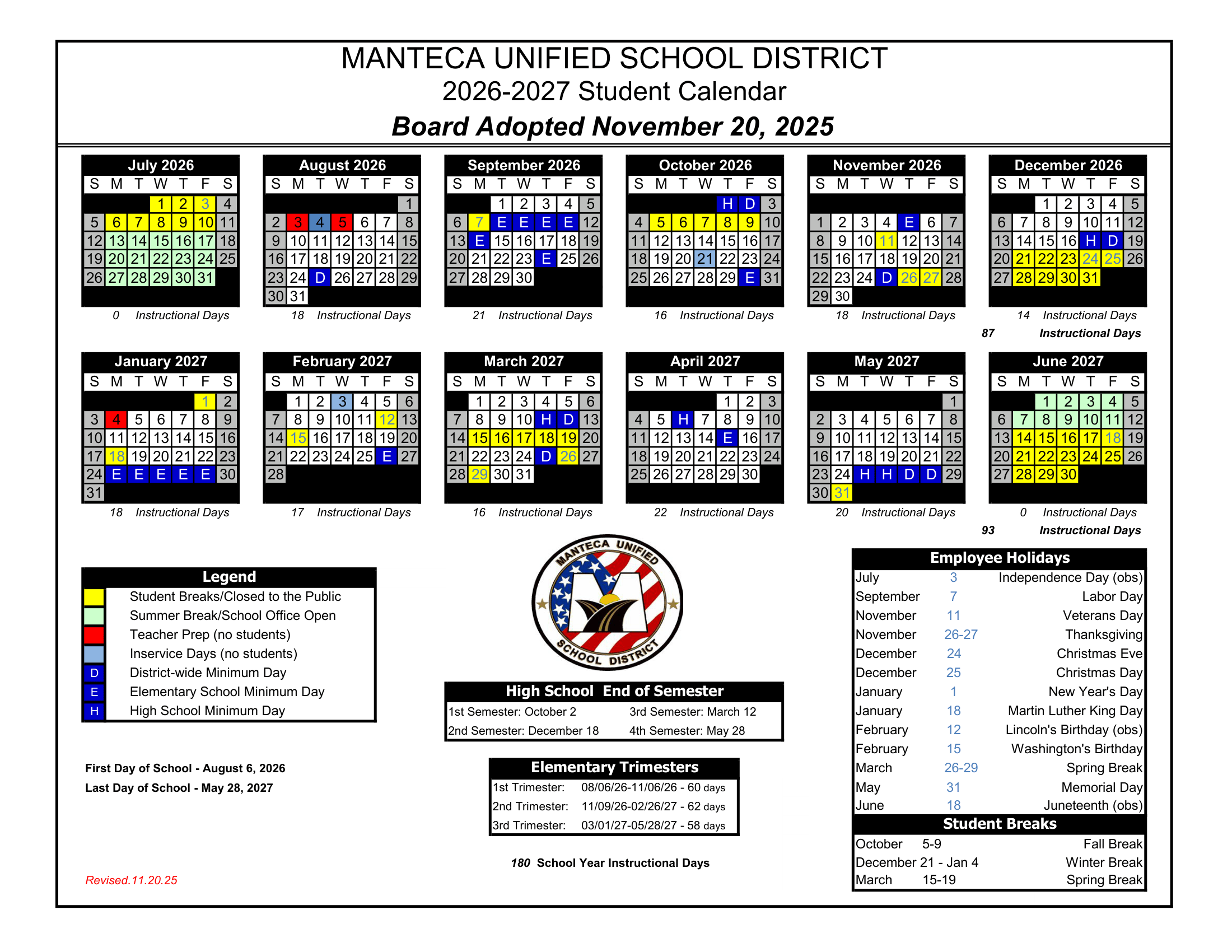 Dates are sourced from the official Manteca Unified School District 26-27 Revised [PDF] website. Dates may change at the discretion of the district. Always verify with the official school website for the latest updates.