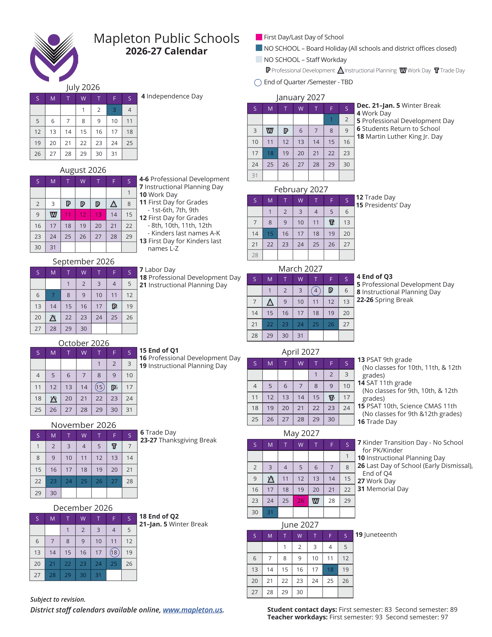 Dates are sourced from the official Mapleton Public Schools 26-27 Calendar Updates website. Dates may change at the discretion of the district. Always verify with the official school website for the latest updates.