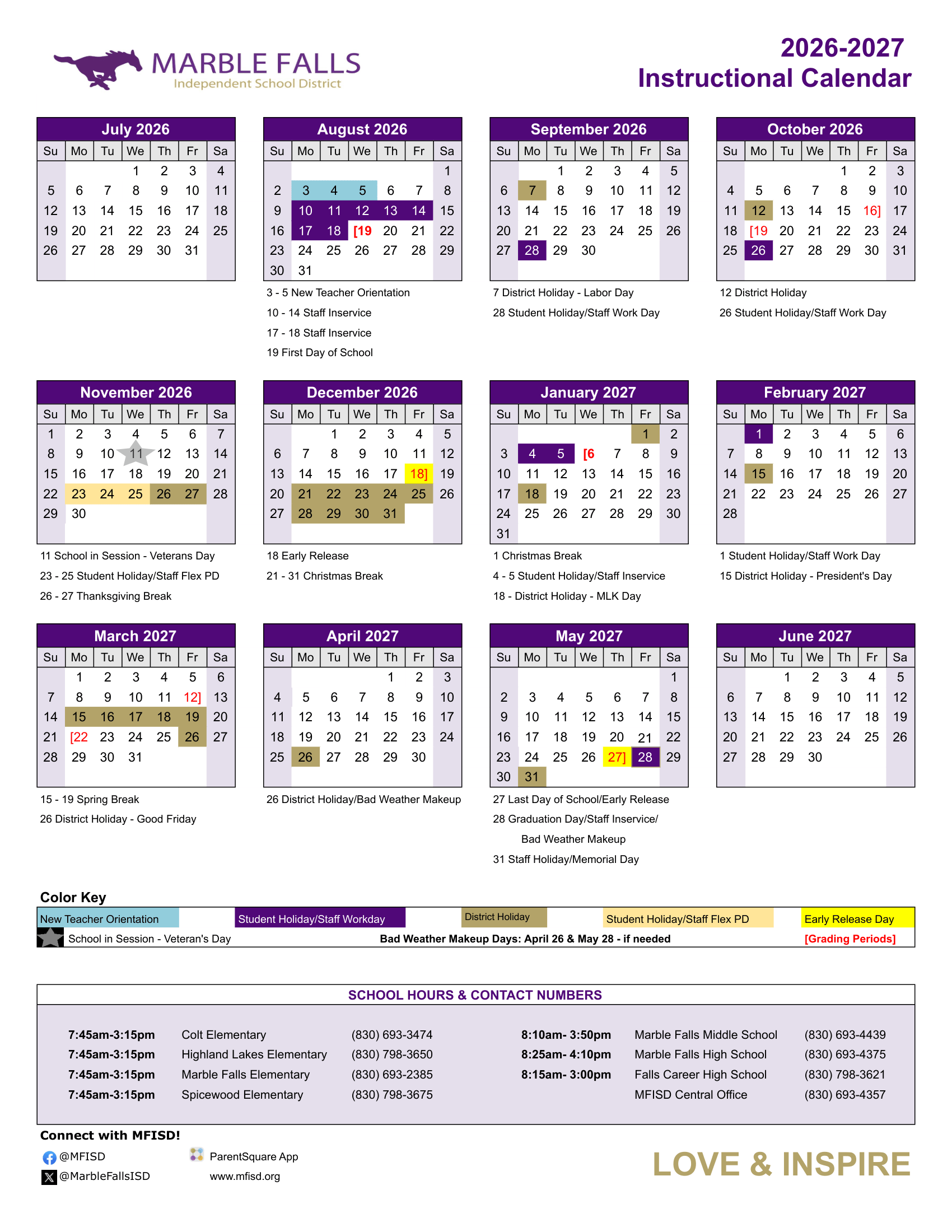 Dates are sourced from the official Marble Falls ISD Calendar 26-27 Revised [PDF] website. Dates may change at the discretion of the district. Always verify with the official school website for the latest updates.
