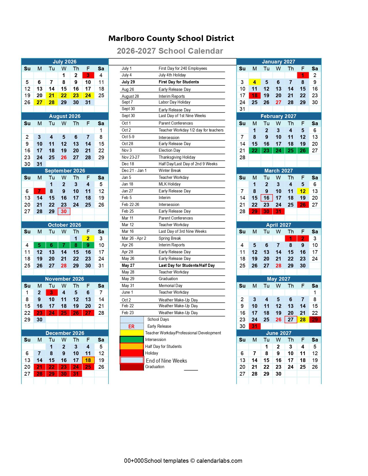 Marlboro County School District Calendar (2026-2027)