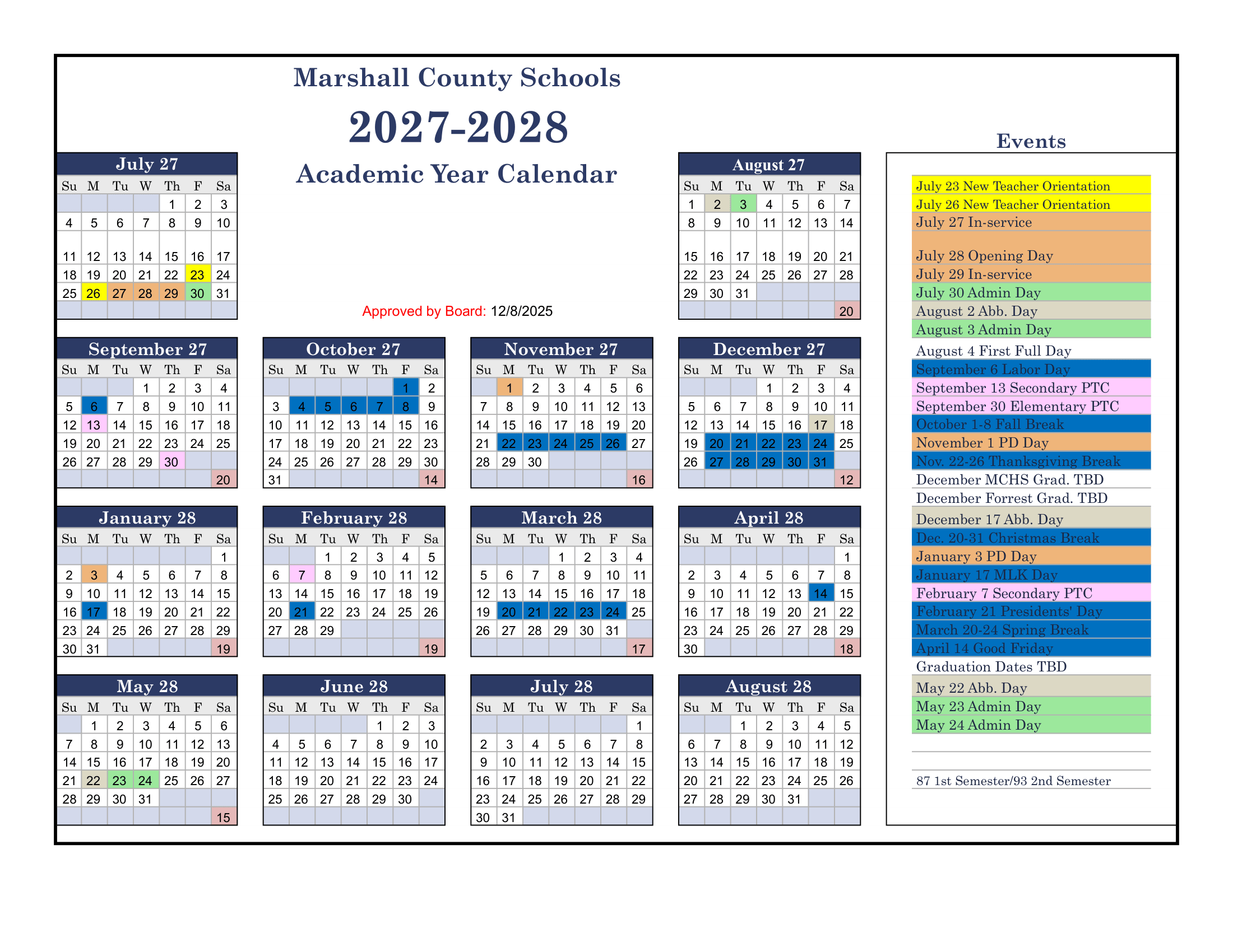 Marshall County Schools School Calendar (2027-2028)