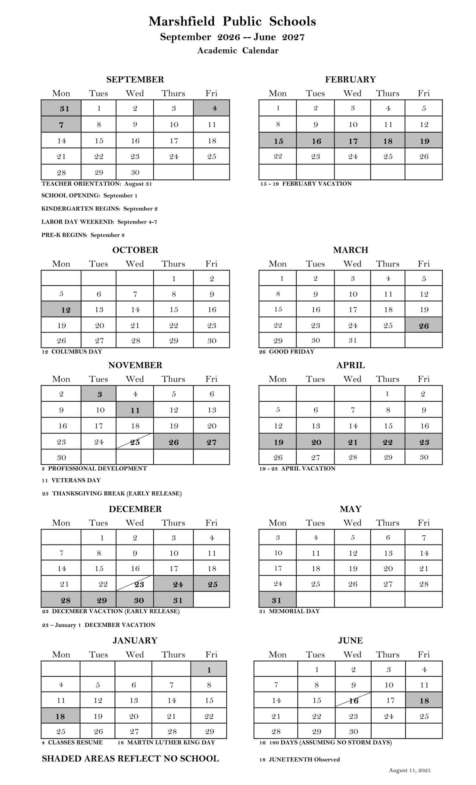 Dates are sourced from the official Marshfield Public Schools MA Calendar 26-27 Revised [PDF] website. Dates may change at the discretion of the district. Always verify with the official school website for the latest updates.